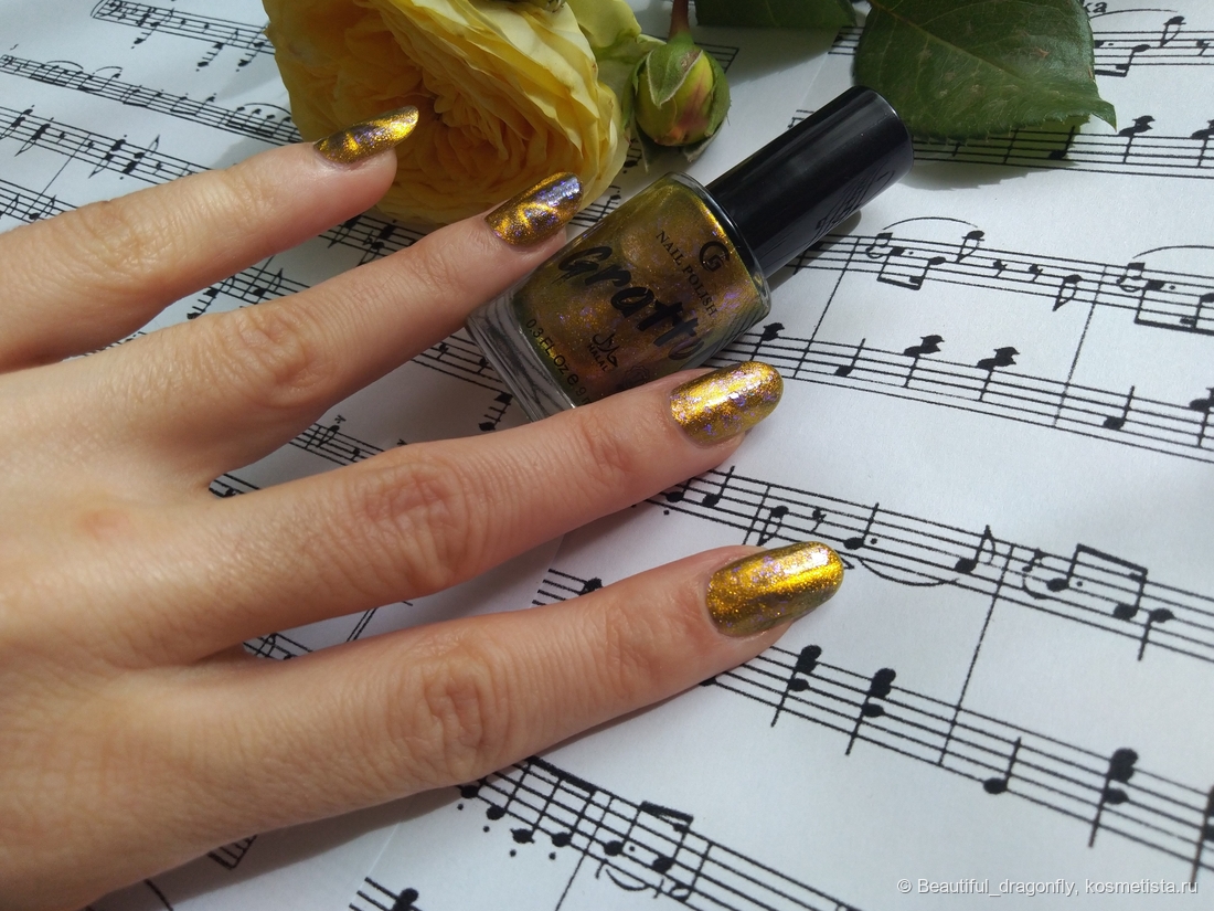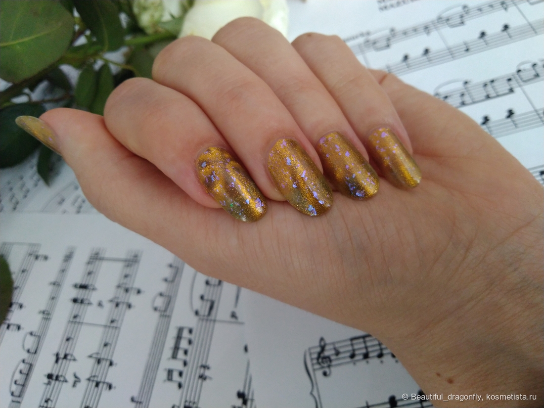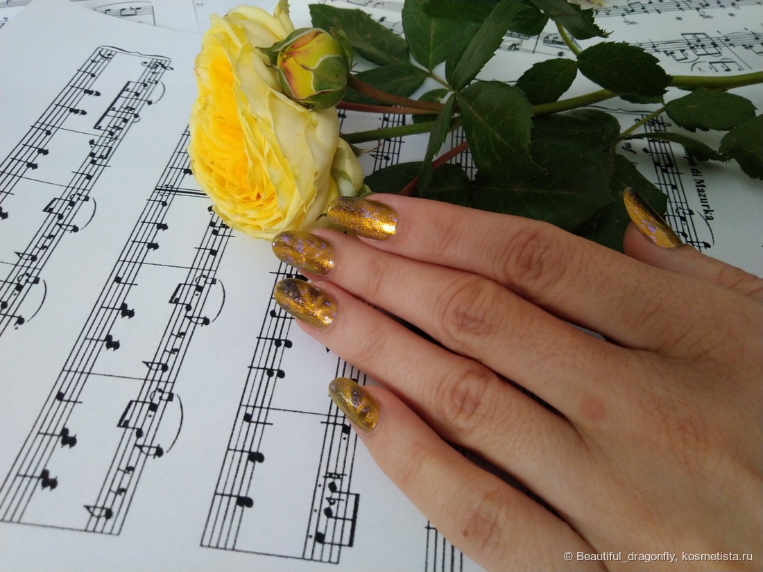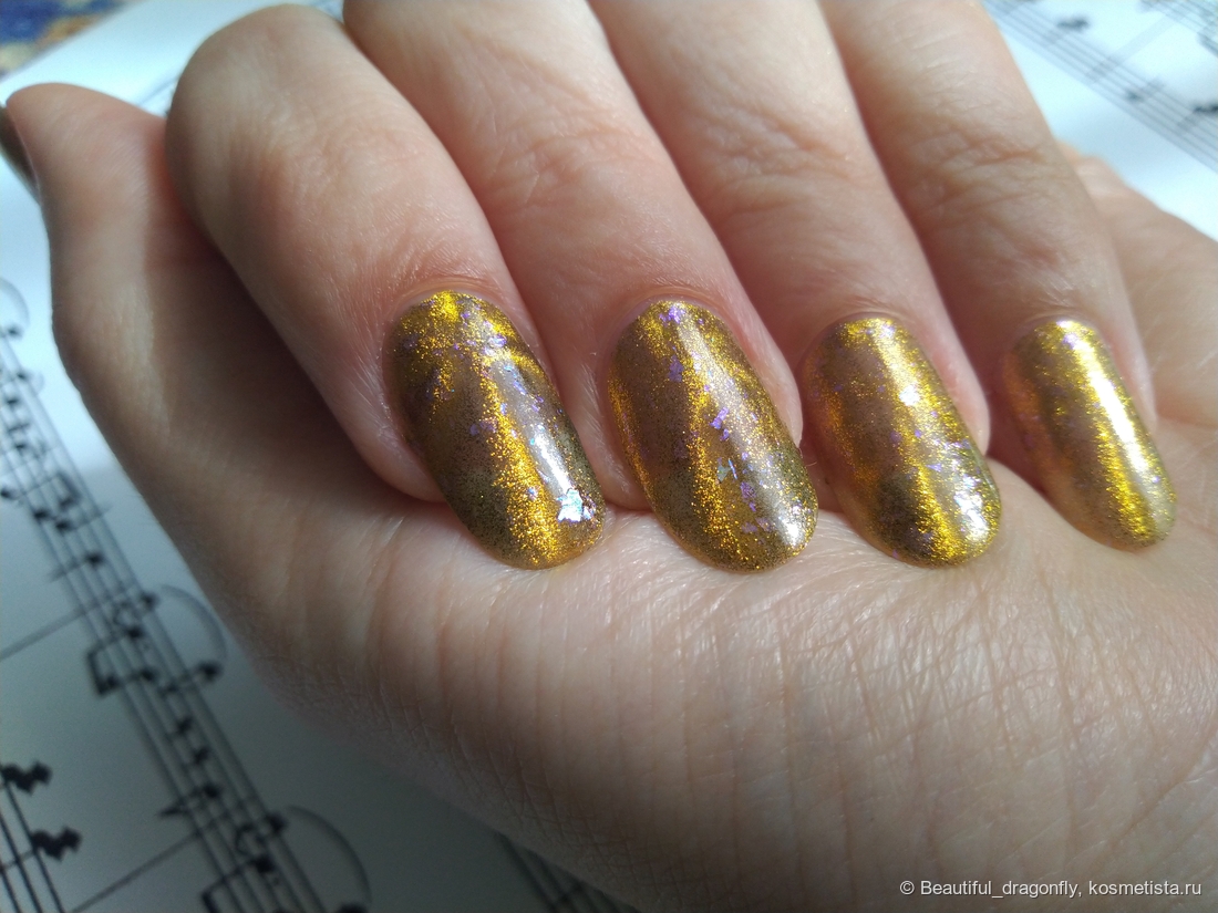 Данный оттенок лака очень нарядный, солнечный и небанальный за счет наличия синевато-фиолетовой слюды, а сочетание чёрного и золотого придаёт лаку благородства и роскоши.