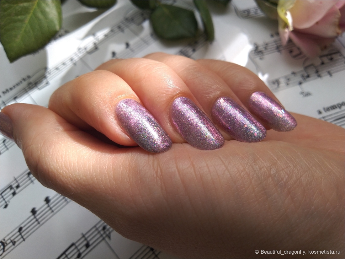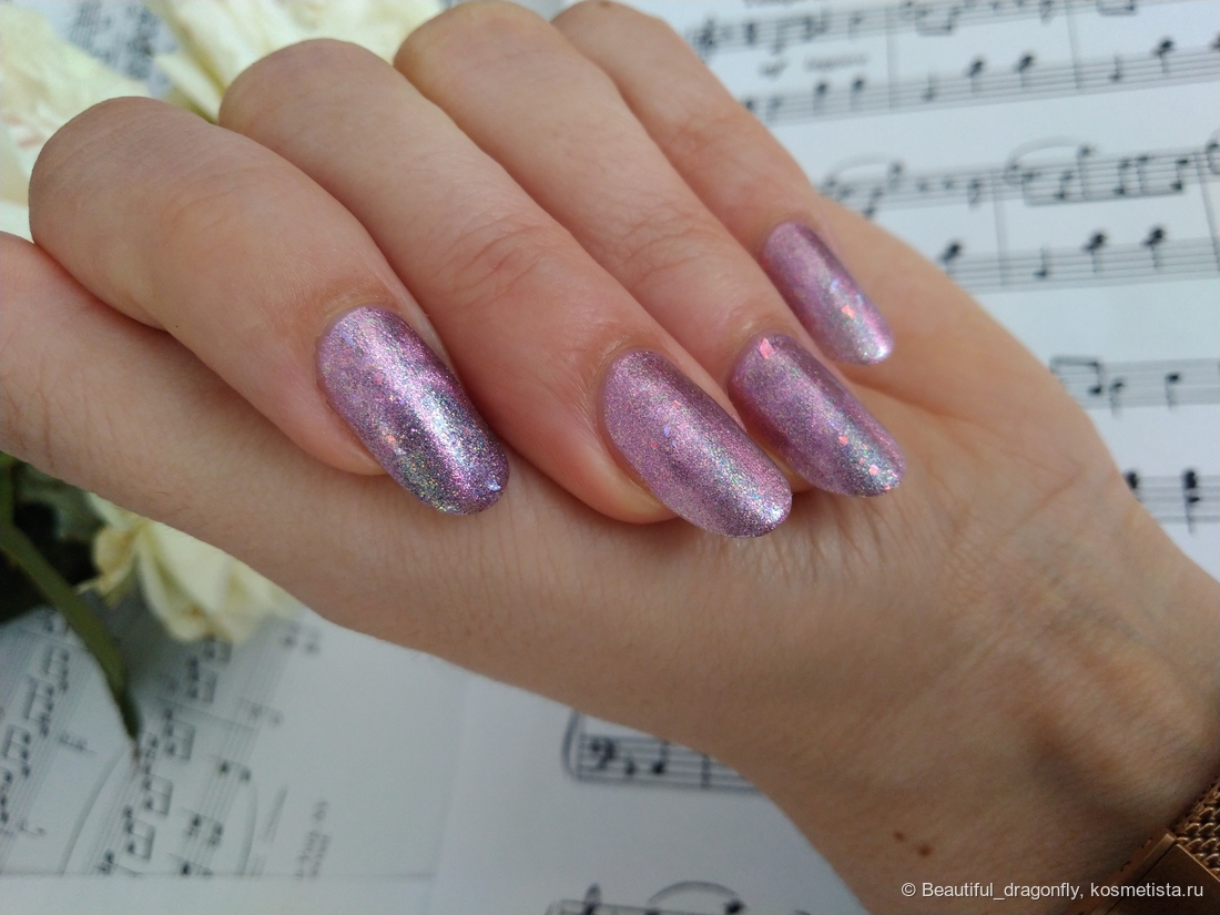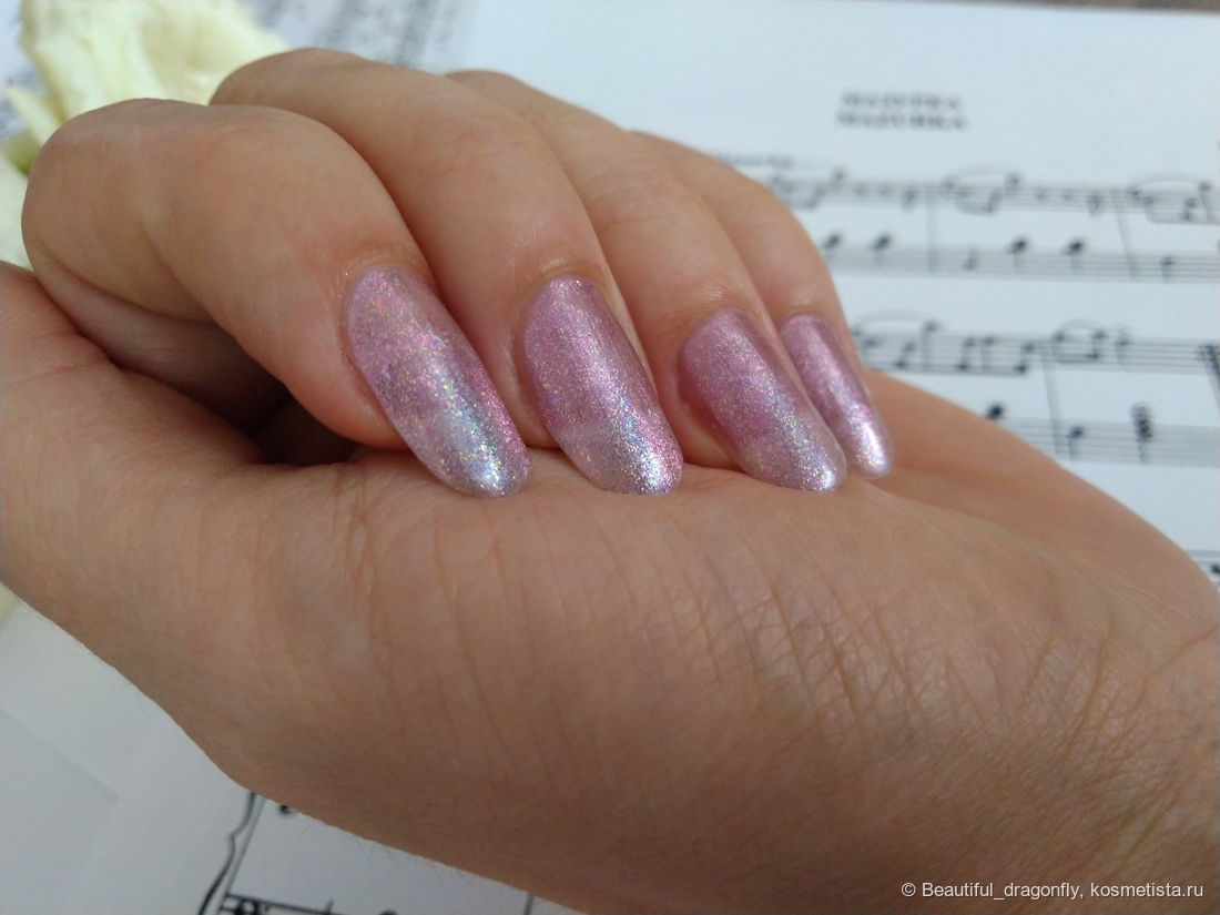Ну какого же цвета может быть лак в названии которого присутствует слово «Принцесса»?! Правильно — розового. И в данном случае это со слов производителя «лилово-сизое желе с магнитным голографическим пигментом розового отлива, золотисто-зёленым голографическим пигментом, фиолетовой мелкой и разноразмерной рваной розовой слюдой».