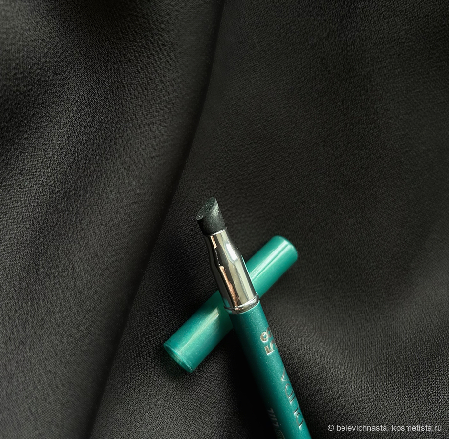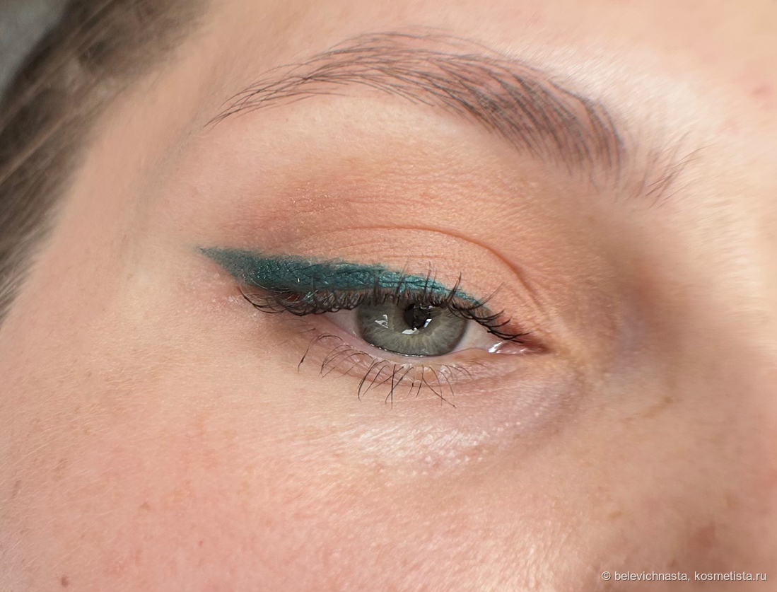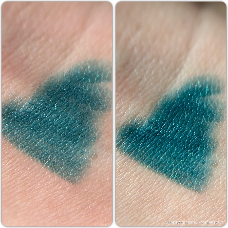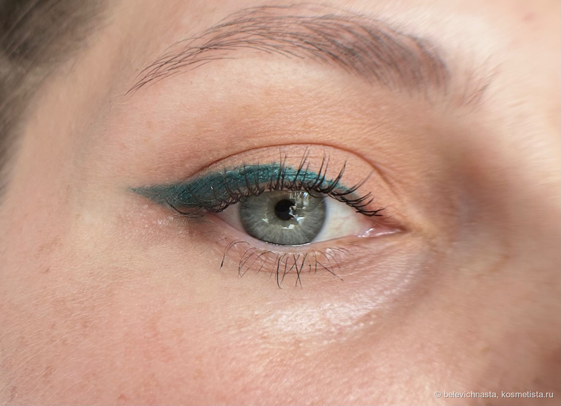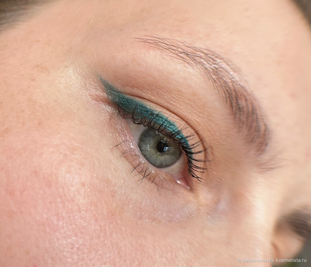 У меня в косметичке много-много лет подряд был его брат в 02 оттенке «electric green», который по факту красивый глубокий тил. До сих пор хочу себе гелевую подводку такого цвета — ну вот не люблю я карандаши точить
