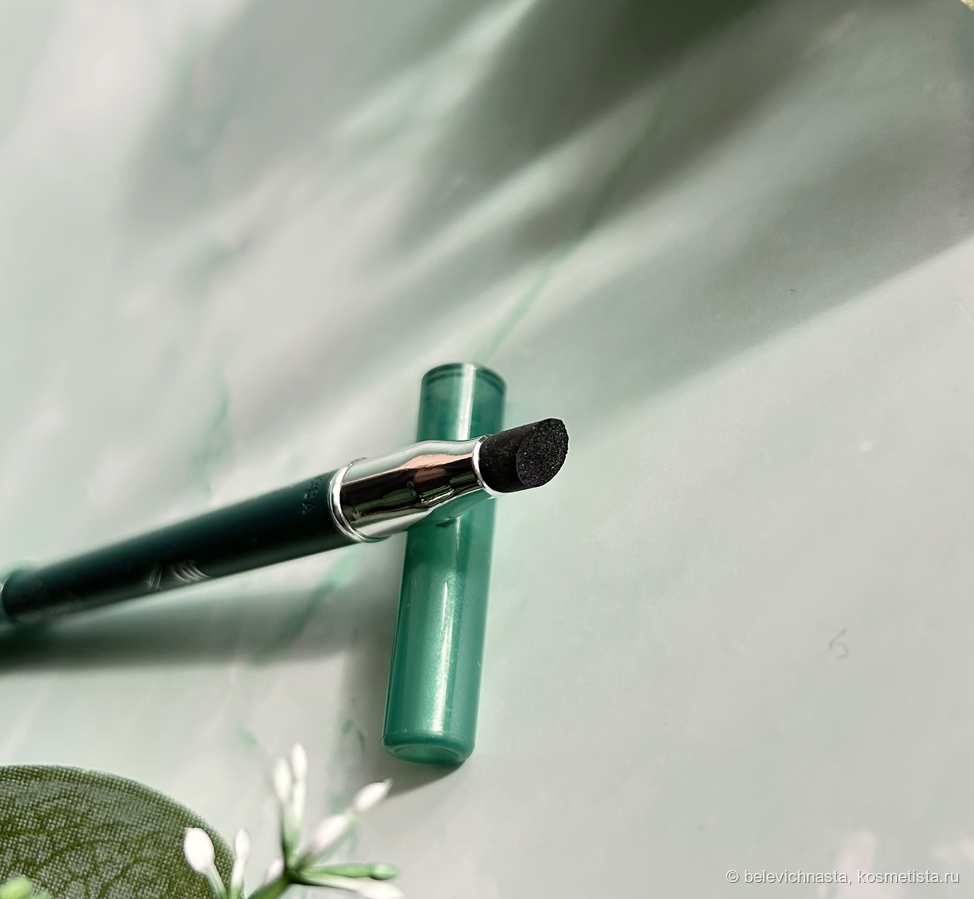 Этим карандашом хорошо получаются и стрелки, и тушевки, а еще он хорошо ведет себя на водной линии. Схватывается быстро и после того, как карандаш застыл, его не растушуешь (а только размажешь), поэтому надо работать быстро. Я люблю его сочетать карандашом Khaki от Shik по нижнему веку и на водной линии.