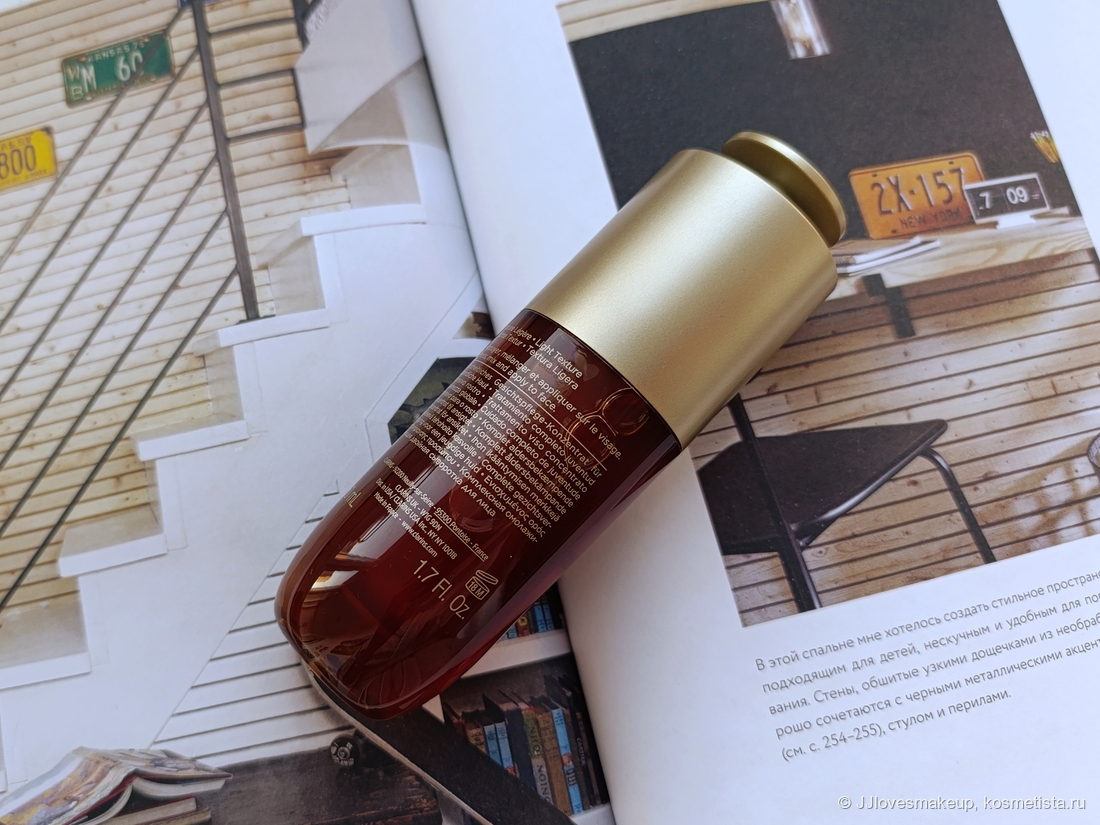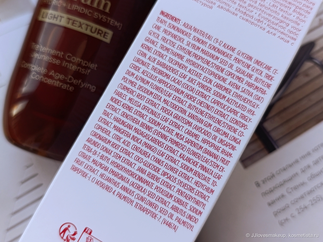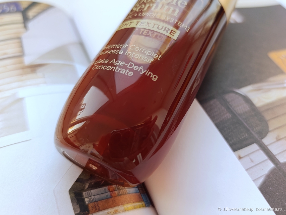 Упаковка: красивая. Прошлая баночка была более рубленой формы, новая изящнее, кроме того, она на 94% состоит из перерабатываемых материалов и содержит меньше пластика по сравнению с предыдущей версией. Старой версии у меня не было, сравнивать не с чем, но эта сыворотка действительно очень изящная, напоминает колбу с эликсиром. Тактильно она бесподобная, в меру тяжёлая, исключительно гладкая, сочетание цвета жжёной карамели и состаренного золота навевает мысли о «тихой роскоши», дозатор разбавляет эту классическую тему и не даёт дизайну скатиться в нафталин.