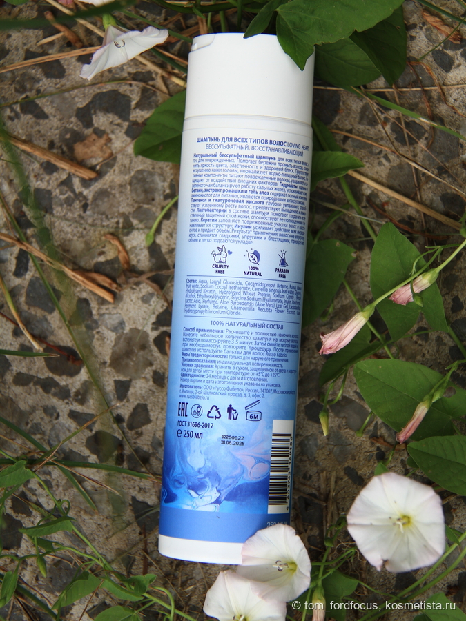 По информации производителя натуральный бессульфатный шампунь подходит для всех типов волос, в том числе, для повреждённых. Нам обещают бережное очищение, питание и увлажнение. Также шампунь должен успокаивать кожу головы, сохраняя её естественный микробиом, препятствовать выпадению и способствовать восстановлению волос.