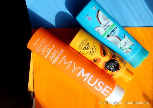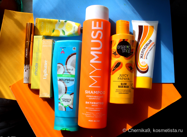 Все средства, описанные выше, помогают мне восстановить повреждённые кончики после летнего зноя. И, хотя шампунь Organic shop Juicy papaya я так и не нашла, заменой ему стала оранжевая версия шампуня Ma muse с экстрактом ананаса, коллагеном, эластаном и маслом макадамии. И, хотя эффект у шампуней немного отличается, мне понравились оба.