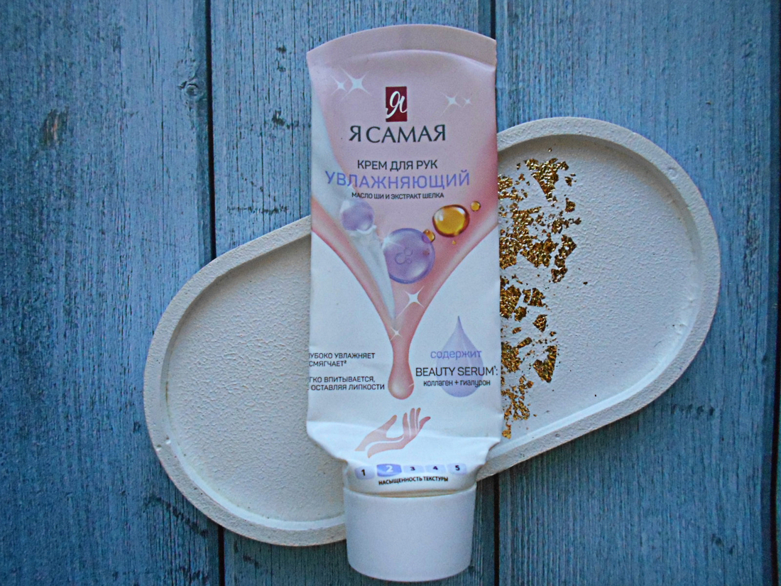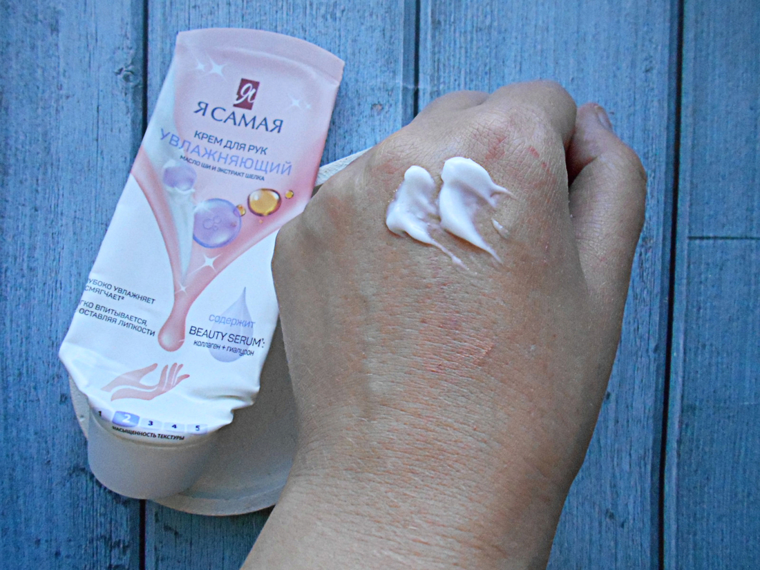 Тоже одно средство — увлажняющий крем для рук Я самая «Масло ши и экстракт шёлка» в объёме 75 мл. Очень лёгкий, с таким же ненавязчивым пудровым ароматом. В целом — на троечку. Увлажняет слабовато, но быстро впитывается и не оставляет жирных следов.