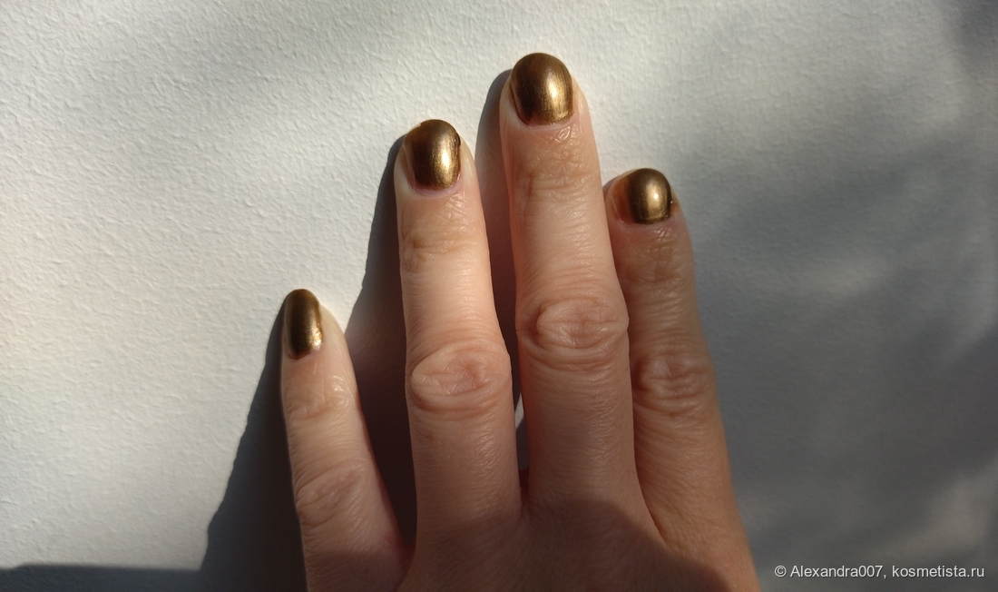 По пигментации лак хорошист, в 1 слой ложится плотно, но тк мне всегда хочется по насыщеннее оттенок, крашу в 2 слоя. Свой перелив у лака хорош, но на фото нанесла дополнительно топ.