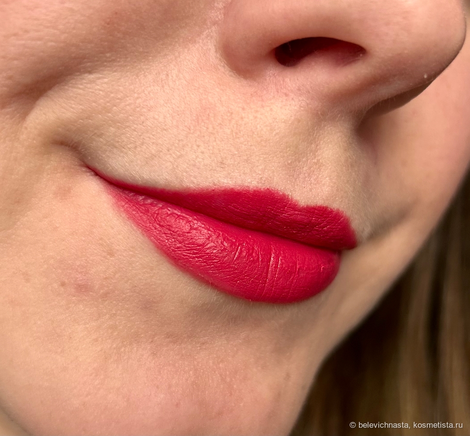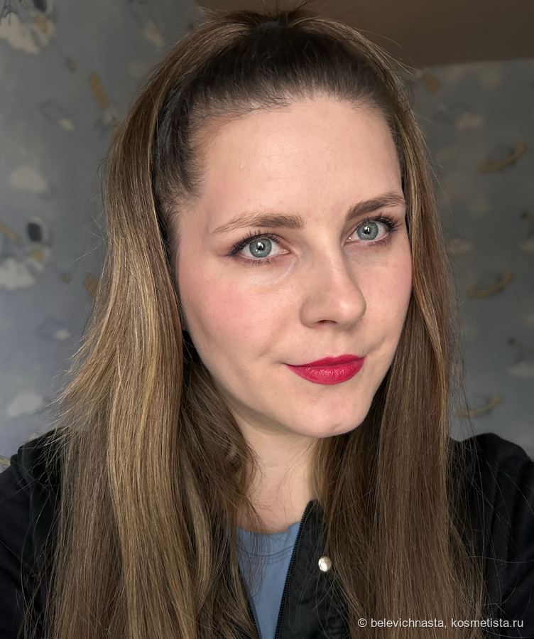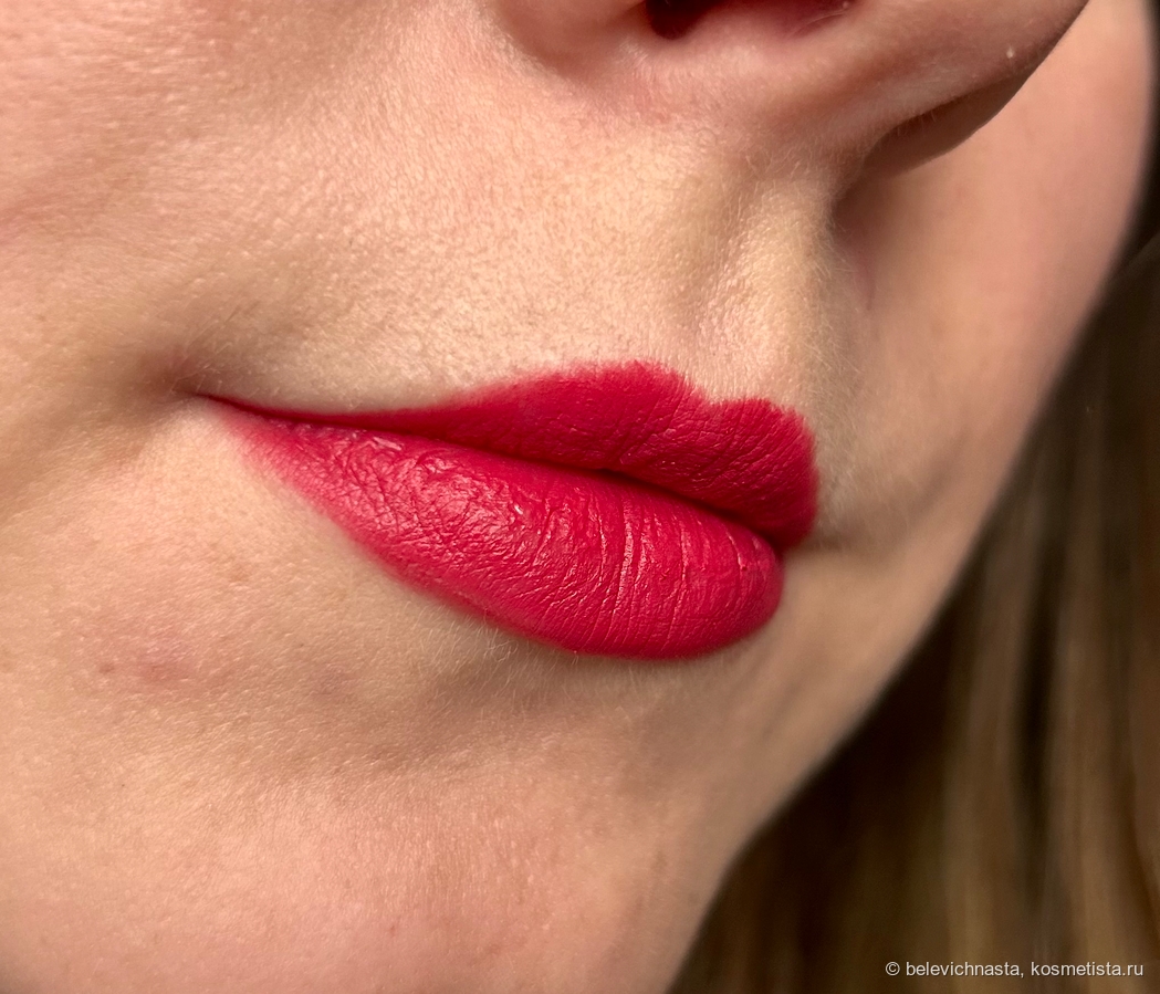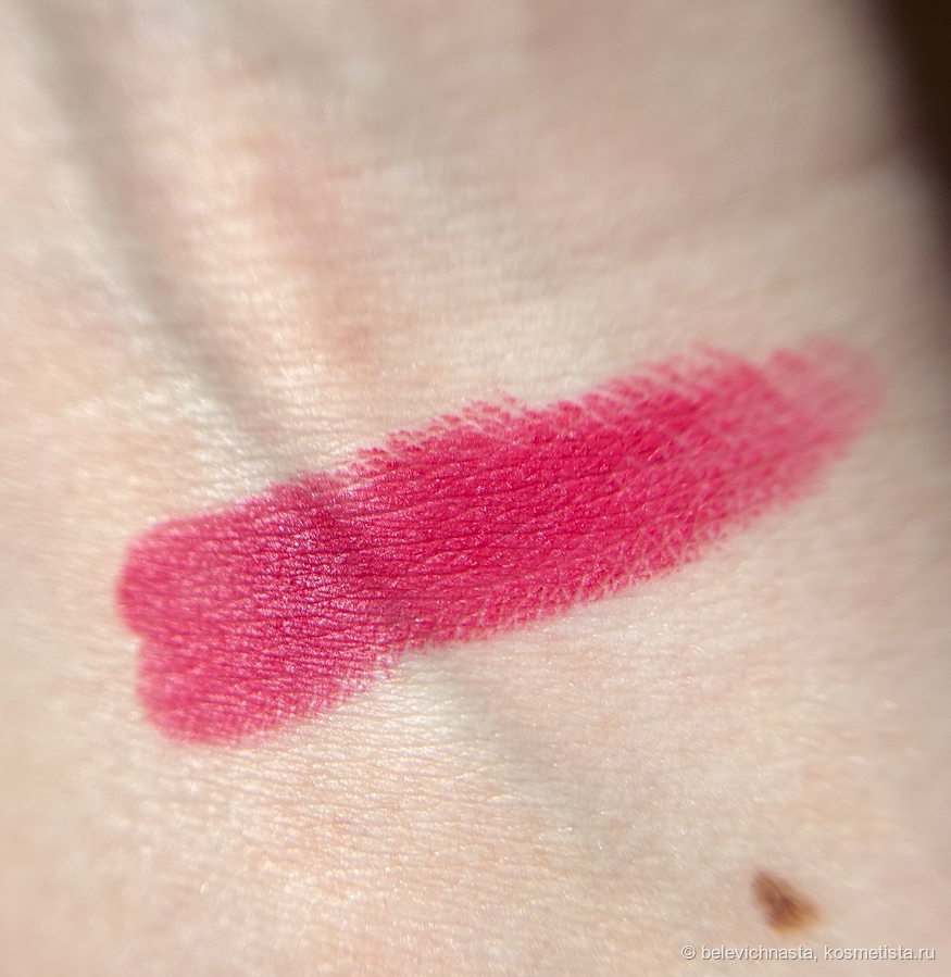 В отражении в зеркале я вижу отчетливый малиново-красный оттенок на себе, но на фотографиях или со стороны картина может быть иная и надо быть готовым к тому, что вы и окружающие могут видеть разные оттенки этой помады при различном освещении.