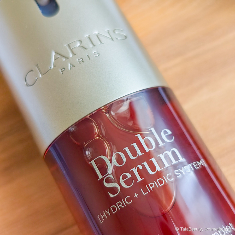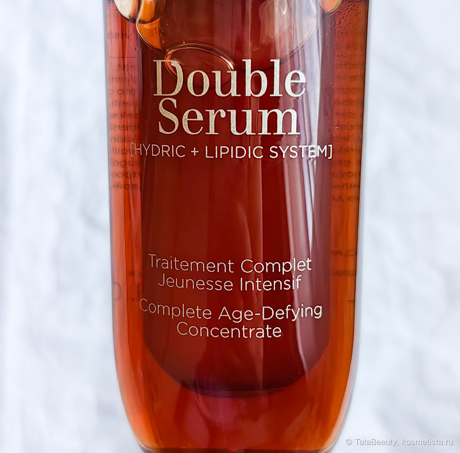 У меня классическая версия сыворотки, которая адресована обладателям нормальной, сухой и обезвоженной кожи, у меня кожа нормальная. Есть также сыворотка в более лёгкой версии Light. По текстуре классическая сыворотка плотненькая, чуть тягучая, маслянистая, это не лёгкая водичка. Распределяется по коже комфортно. Впитывается пару минут, мне это нравится, потому что на сыворотку я делаю массаж своим массажёром для лица. Пару минут ещё чувствуется не значительная липкость, далее сыворотка полностью впитывается и оставляет на коже приятное ощущение. У меня нормальный тип кожи, мне вполне хватает увлажнения и питания от Double Serum и далее я могу не наносить крем. Утром чаще всего поверх наношу вв-крем, а вечером чаще всего ничего не наношу.