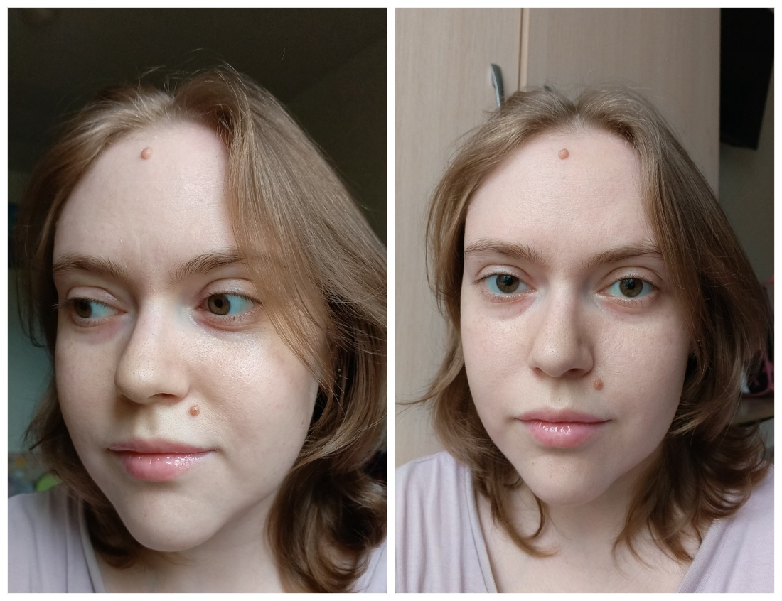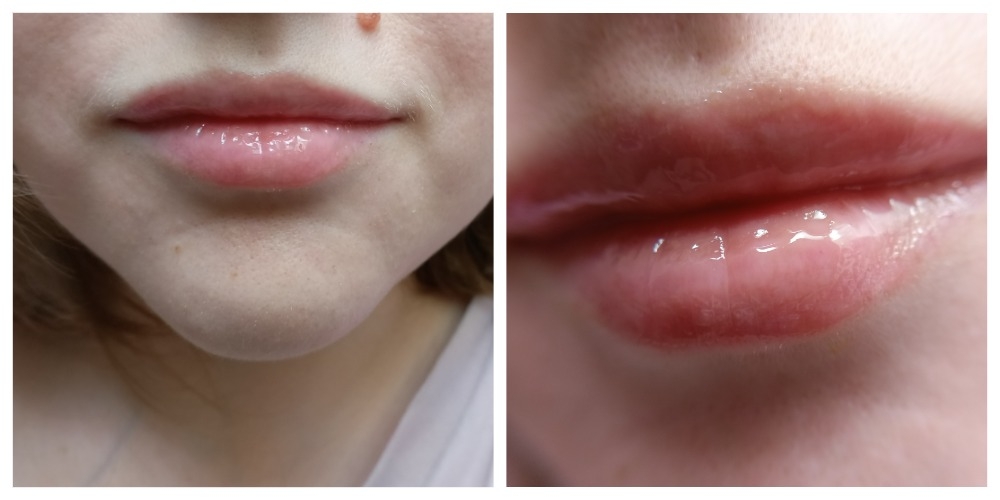 На губах смотрится прекрасно, дает заметный глянец, чуть высветляет губы. В моем случае делает общий образ более холодным, у моих губ оттенок с явной рыжиной. При этом светлый цвет не затекает в рельеф, не скатывается в белую полоску и не забивается в шелушения.