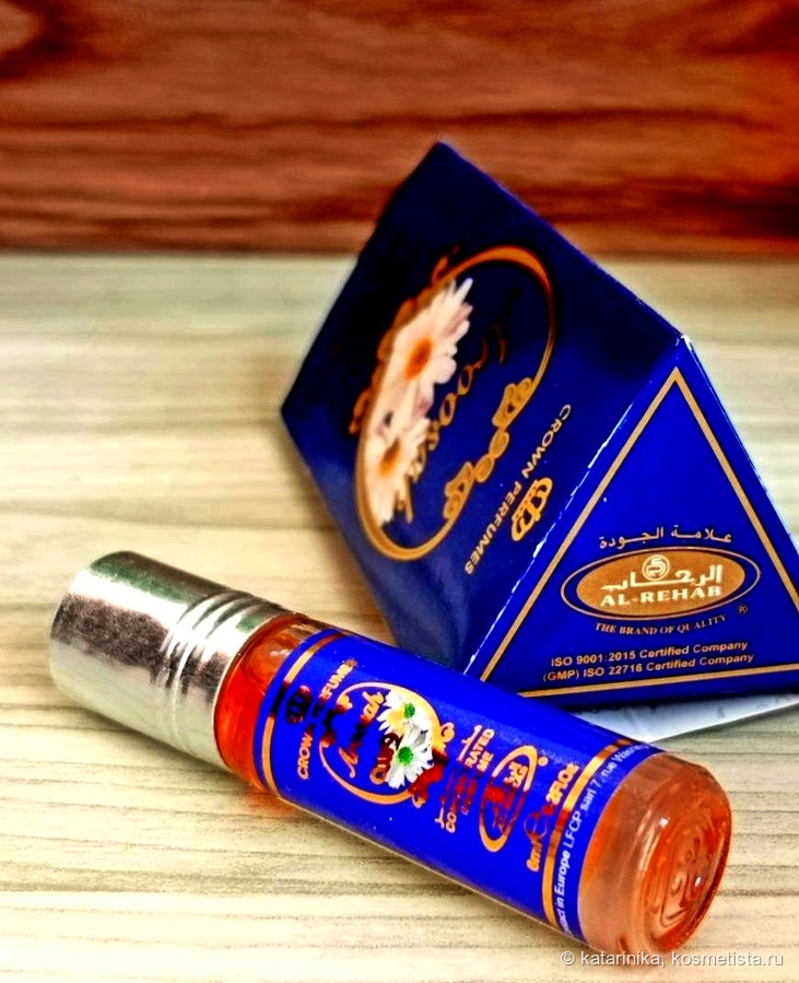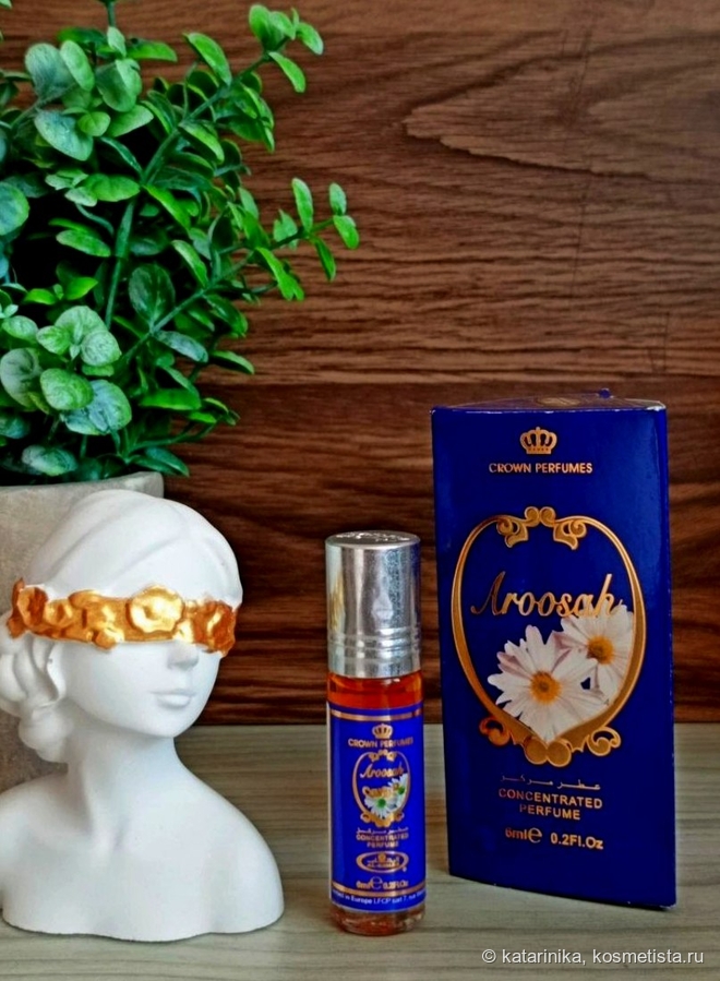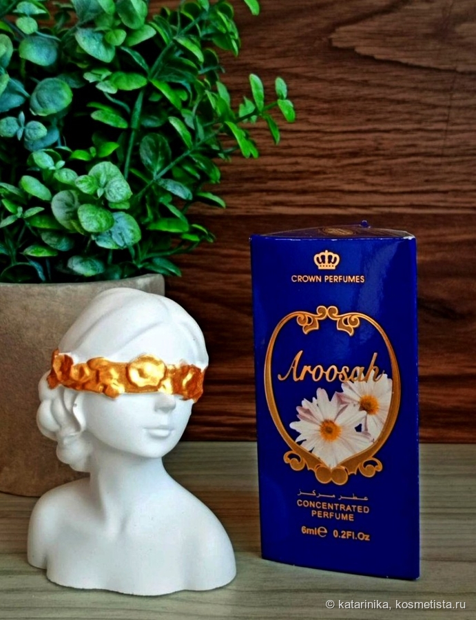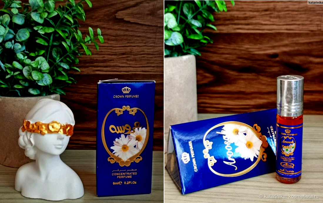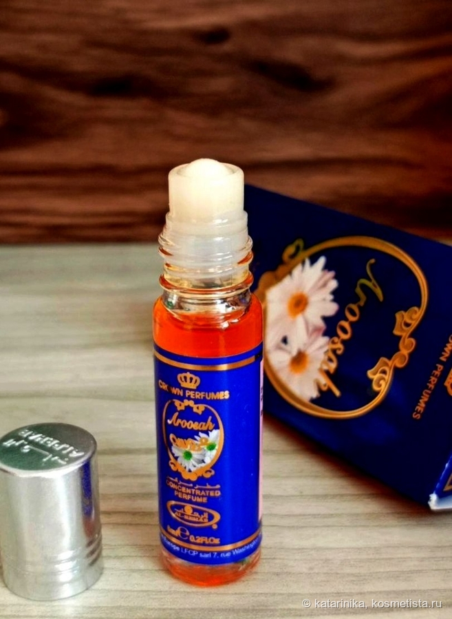 Флакончик, как у всех масляных духов Al Rehab, с роликом, упакован в треугольную коробочку с арабской вязью. Симпатично, по-восточному. А название-то какое! Aroosah — Корона невесты. Правда, мне почему-то кажется, что если и наденет невеста эти духи, то сразу снимет фату и убежит обратно к маме))) В общем, сомневаюсь, что арабские невесты массово благоухают этой «короной».