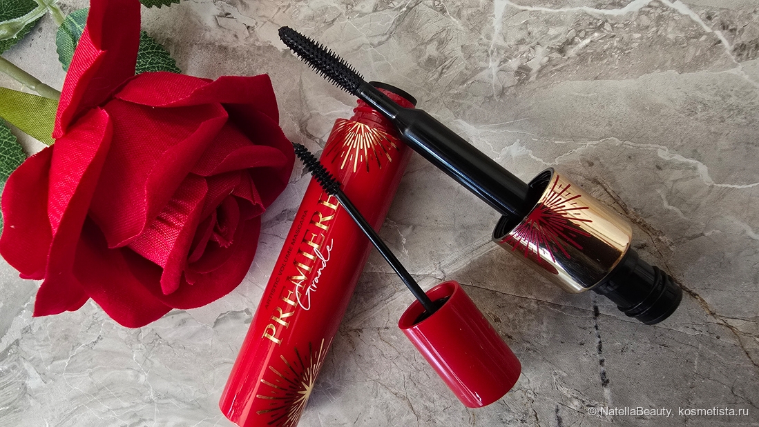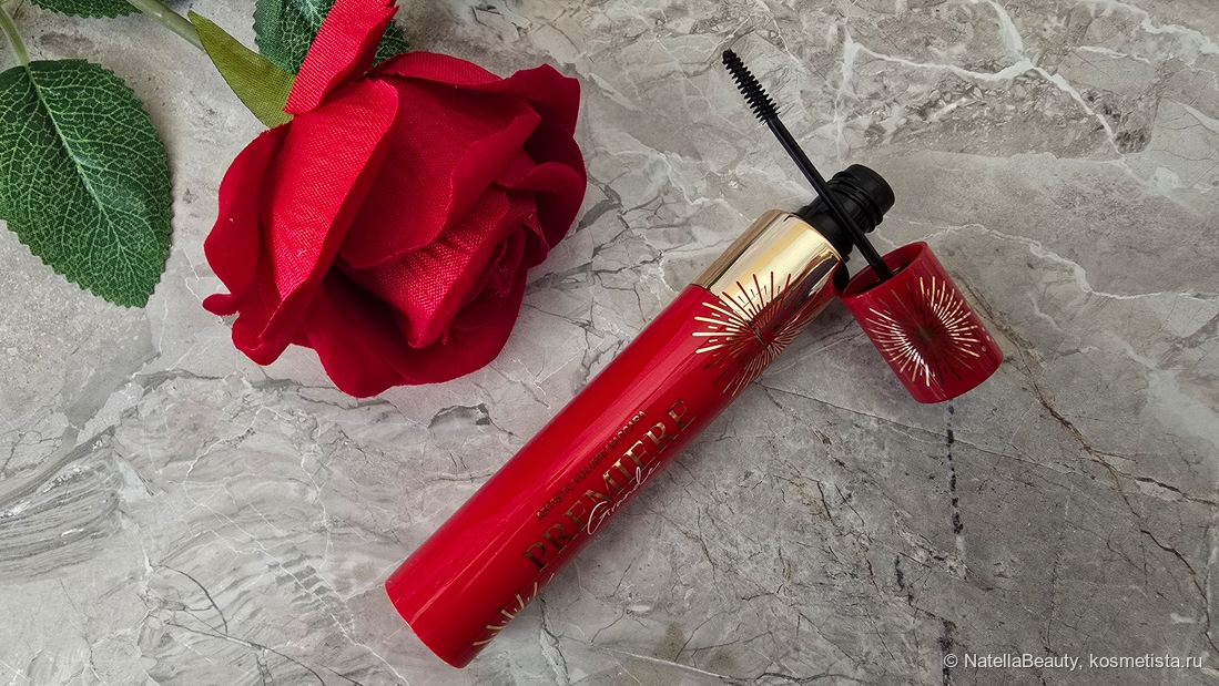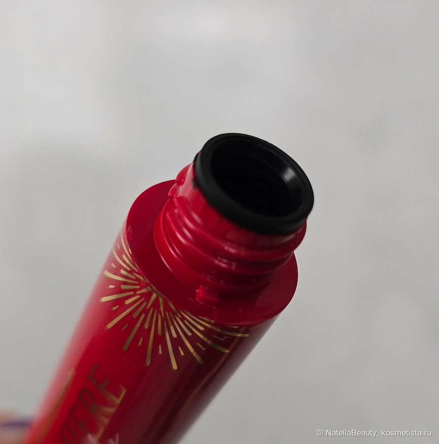Тушь находится в ярко-красном флакончике с золотым орнаментом и надписями. Изначально на копрусе был защитный стикер с информацией о продукте.