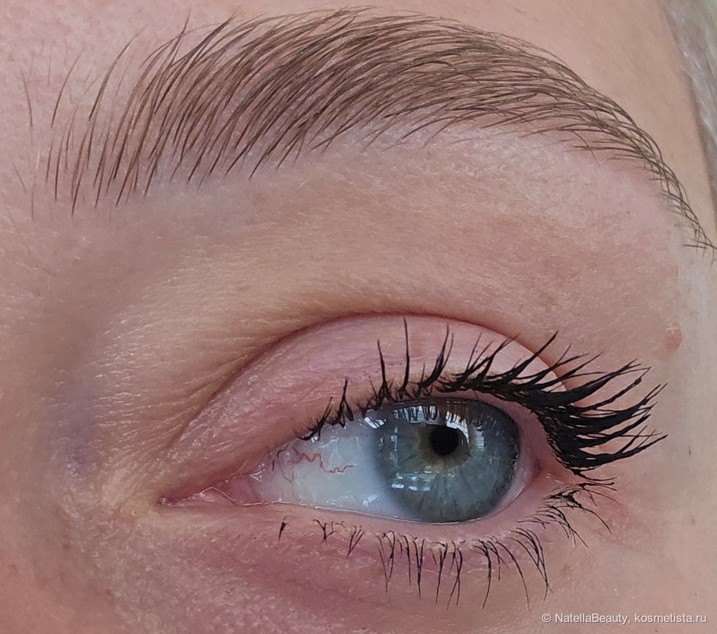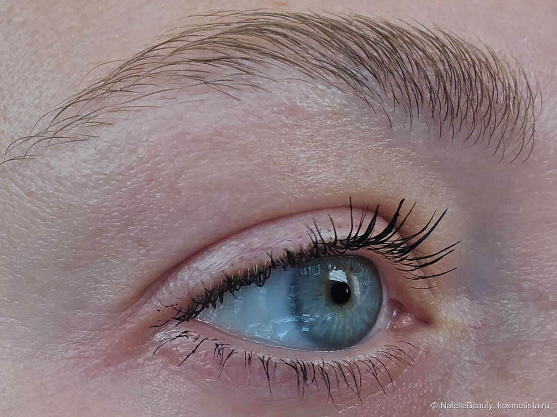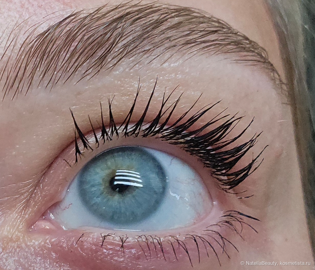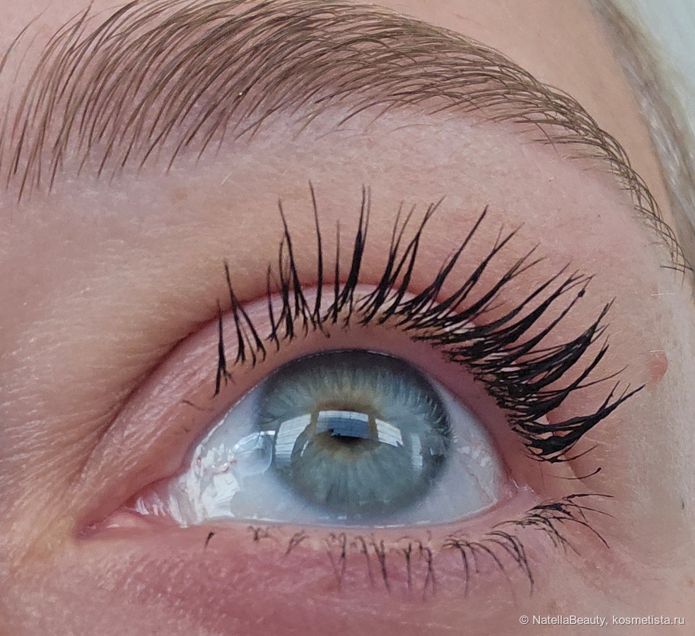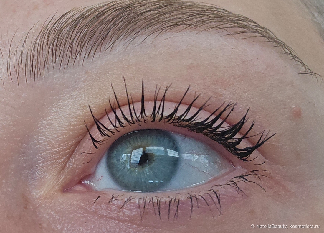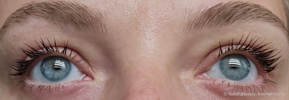 Тушь очень удобная в использовании, она действительно придаёт объем ресницам. Здесь не будет чёткого естественно разделения, хотя она смотрится очень гармонично. Немного склеивает реснички в уголках.