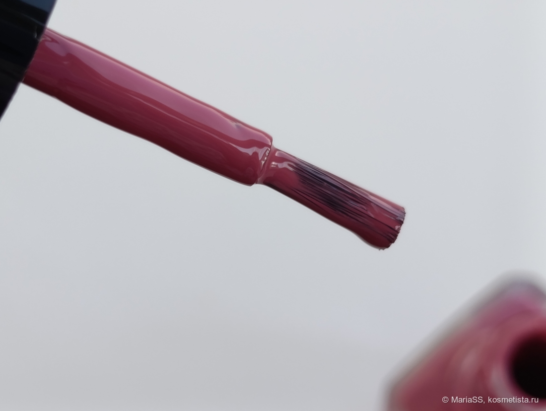 Стеклянные флаконы объёмом 15 мл бывают двух видов: цилиндрической формы и с прямоугольными гранями. У меня второй вариант. Кисточка мягкая, с прямым срезом, набирает достаточное количество лака. Для меня это не самая удобная форма кисти.