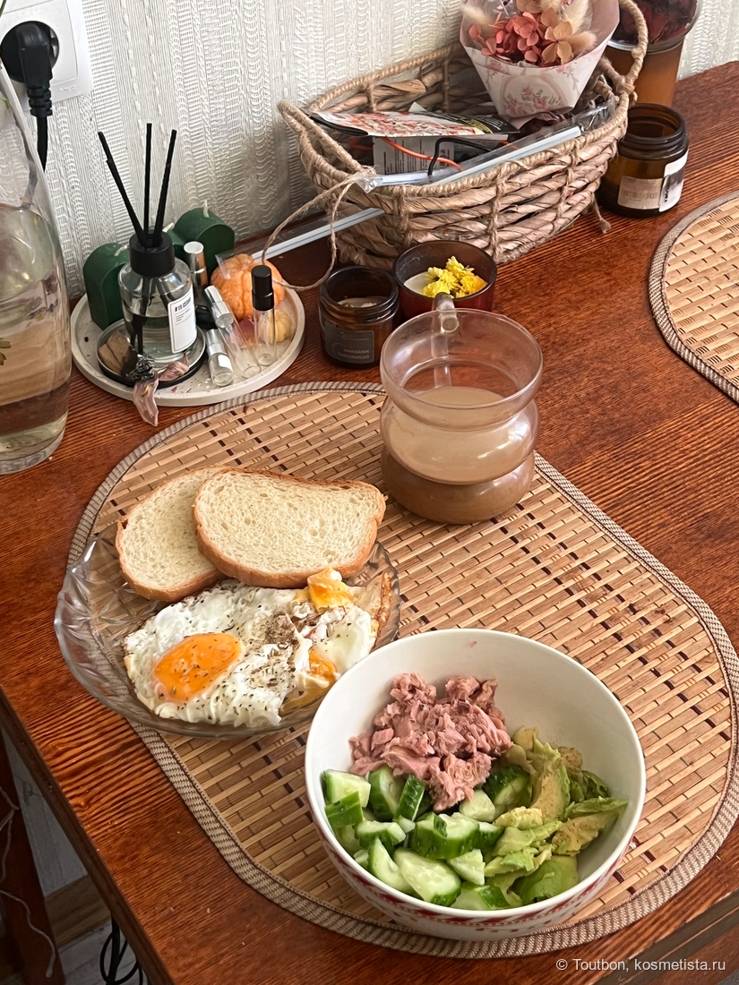 Очень люблю на завтрак шакшуку, но тут у нас а-ля боул авокадо / огурцы / тунец, глазунья из двух яиц и тосты.