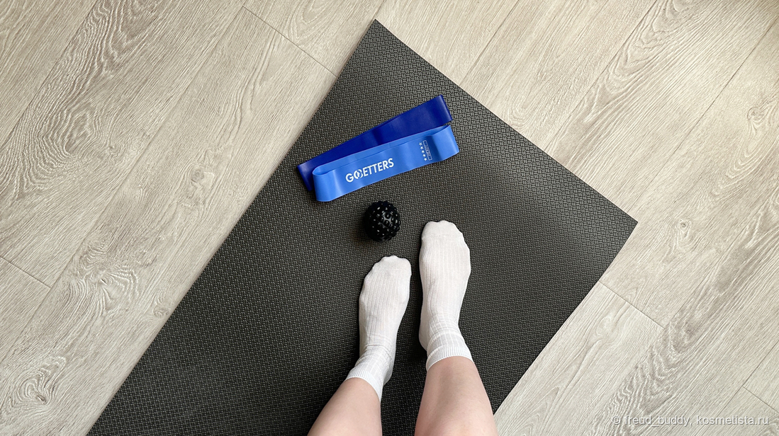 Пока маска делает свою работу, иду на коврик растягиваться-потягиваться. Можно даже назвать это зарядкой: у меня это набор простейших упражнений с резинками, для того чтобы размяться и разогреть суставы и мышцы спины, ног и рук, чтобы не хрустеть как французский багет в течение дня. Более того, это помогает сохранить тело в тонусе, когда я уезжаю из Белграда надолго и я не хожу в зал.