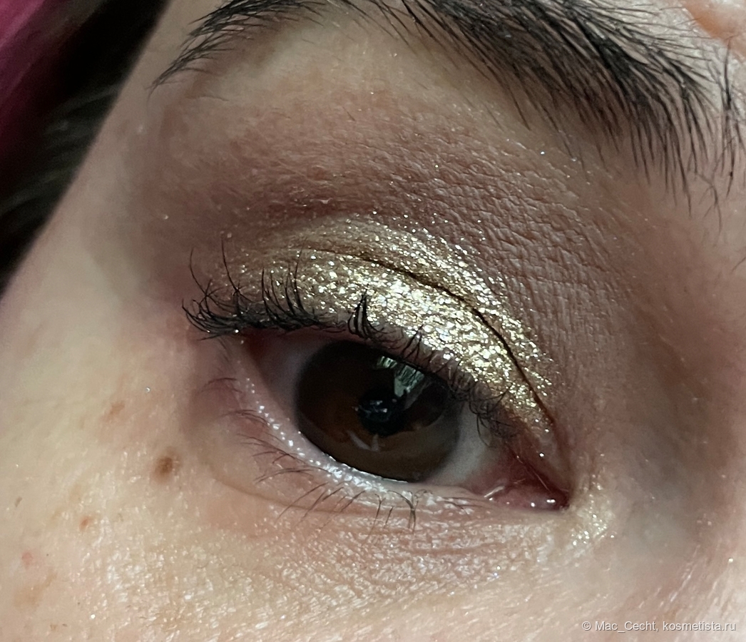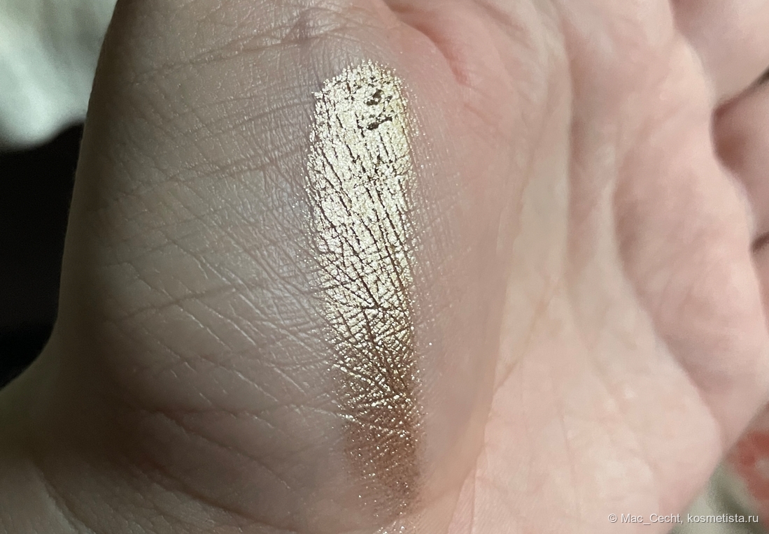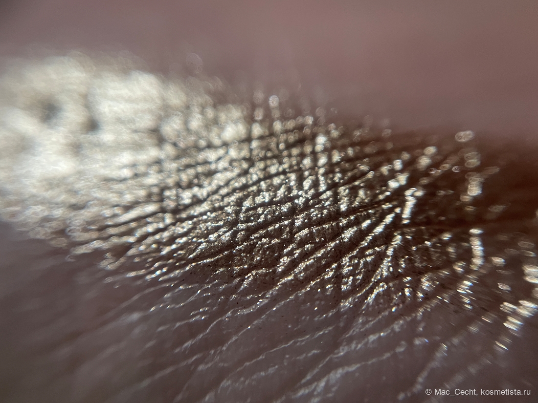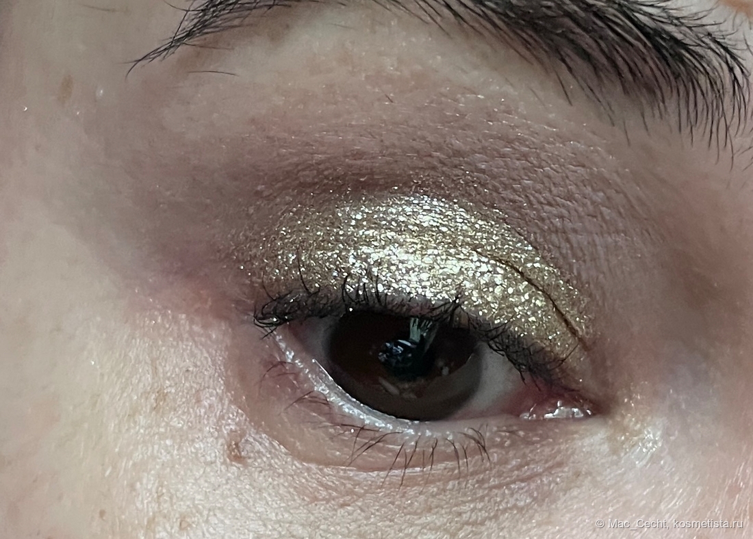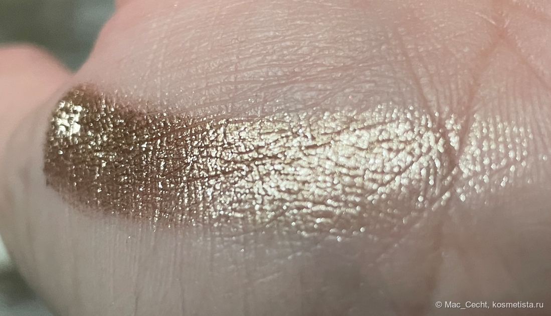 На гладкой коже ляжет вот таким ярким гладким металлом, но у меня на веках такой нет. Не могу сказать, что оттенок жует веко, но текстуру не выгладит точно. Впрочем, он такой красивый, что все равно. 😂