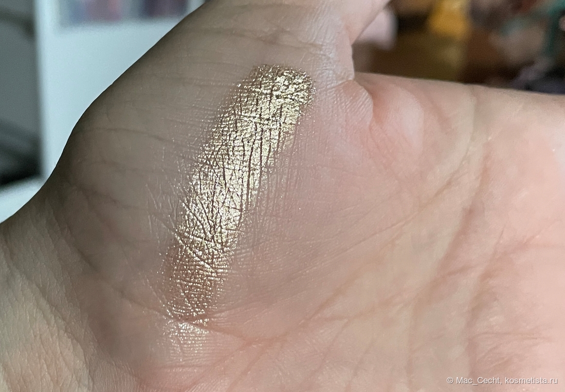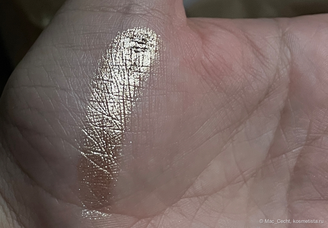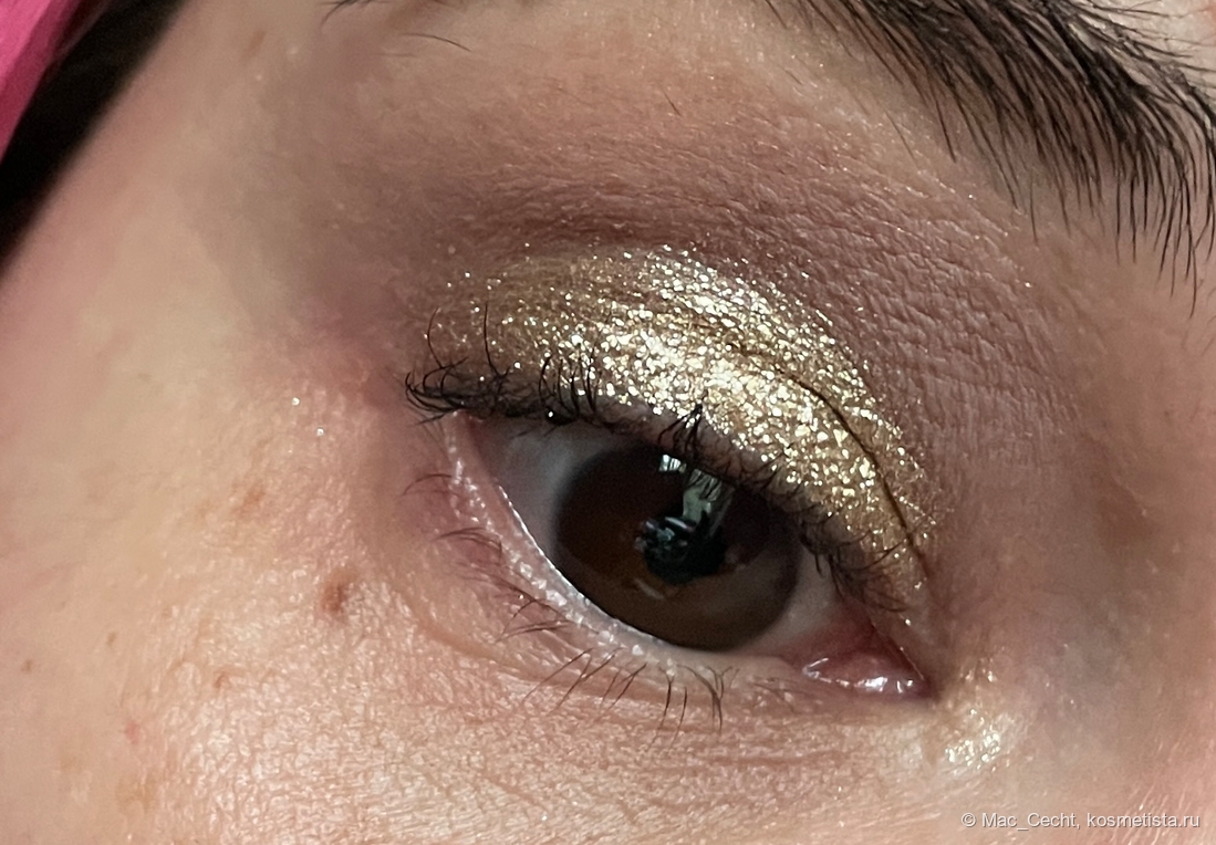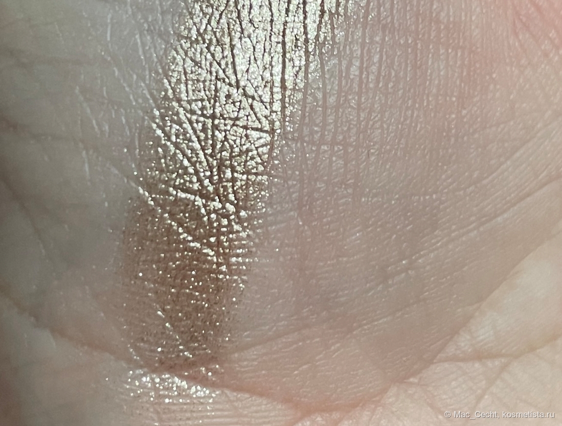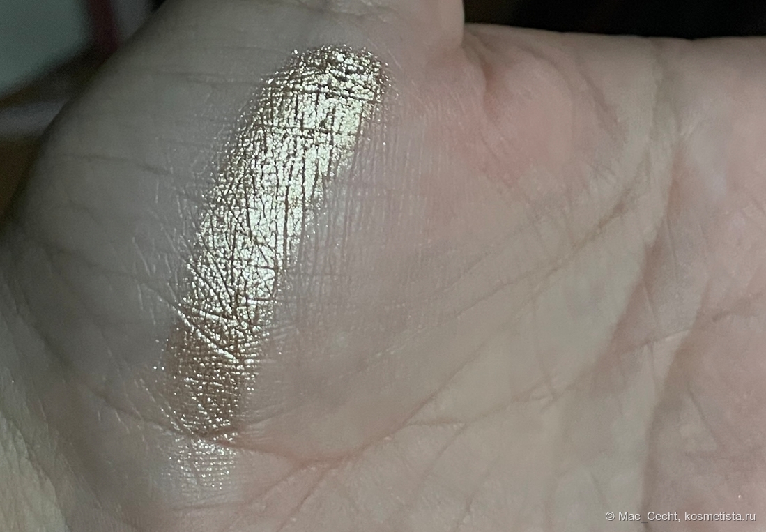 На гладкой коже ляжет вот таким ярким гладким металлом, но у меня на веках такой нет. Не могу сказать, что оттенок жует веко, но текстуру не выгладит точно. Впрочем, он такой красивый, что все равно. 😂