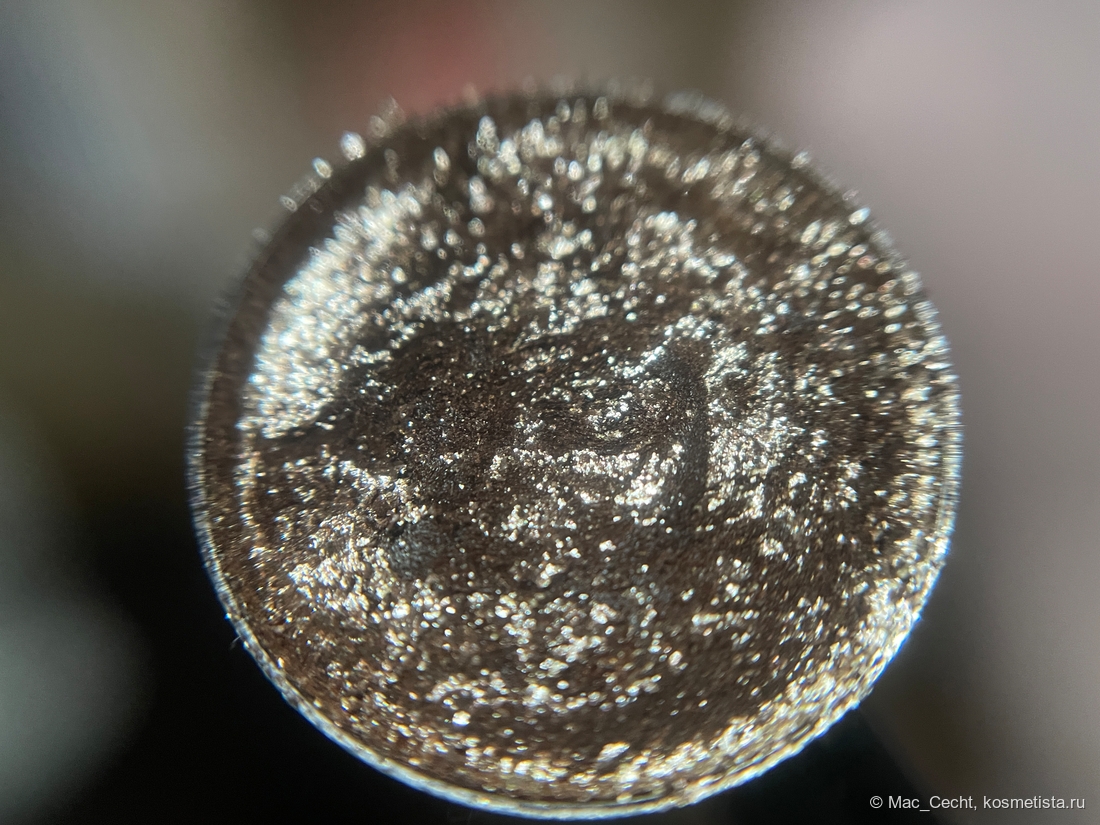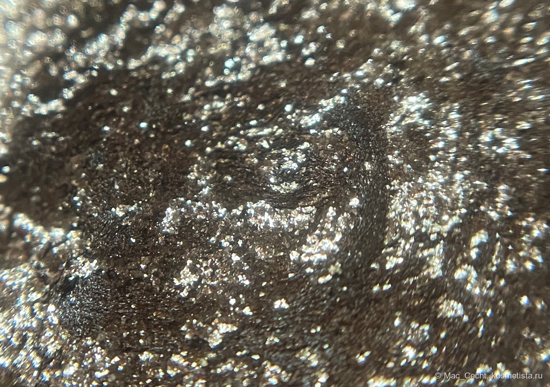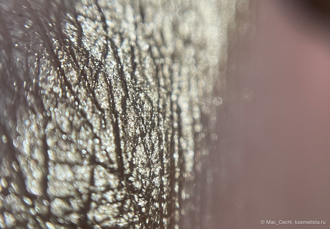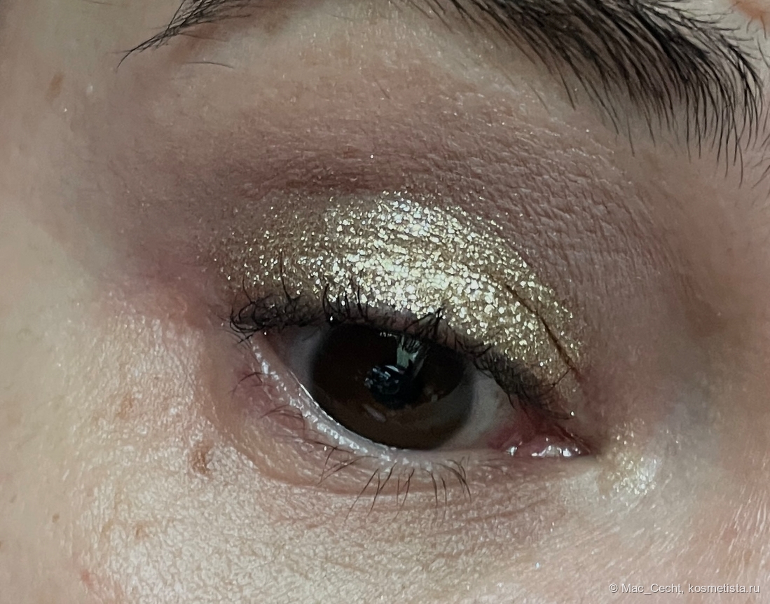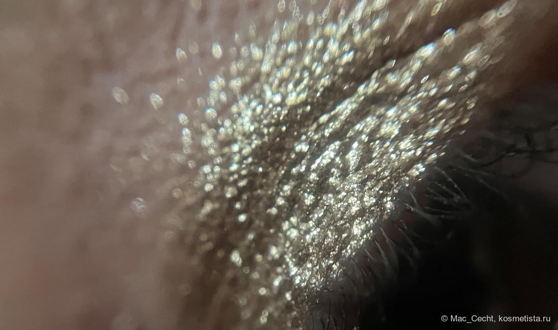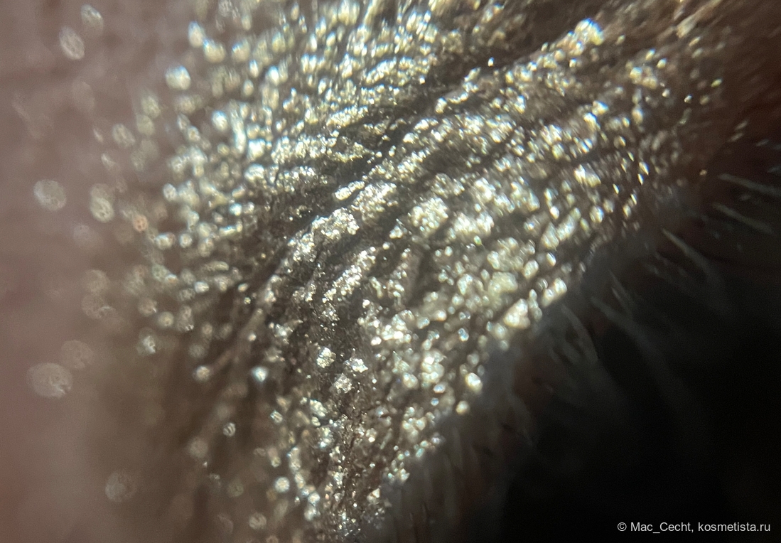 Наносится легко. Хорошо цепляется за кисть, палец и голую кожу. Может чуть осыпаться во время нанесения, текстуру я бы назвала мелкими металлическими хлопьями. Но их можно нанести аккуратно, главное — избегать ресниц, а во время носки не осыпаются.