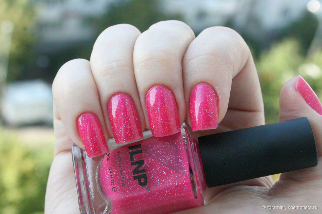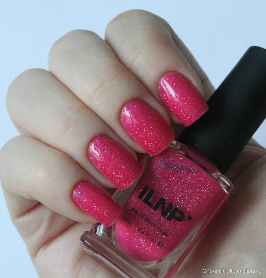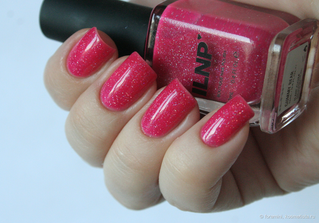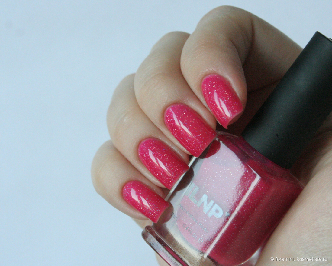 Цвет лака — нейтральный розовый. Он не неоновый и не холодный. В базе присутствуют искорки голографии. По текстуре — желе. Я такие лаки наношу в два средних слоя, но если наносить тоньше, может понадобиться третий слой.