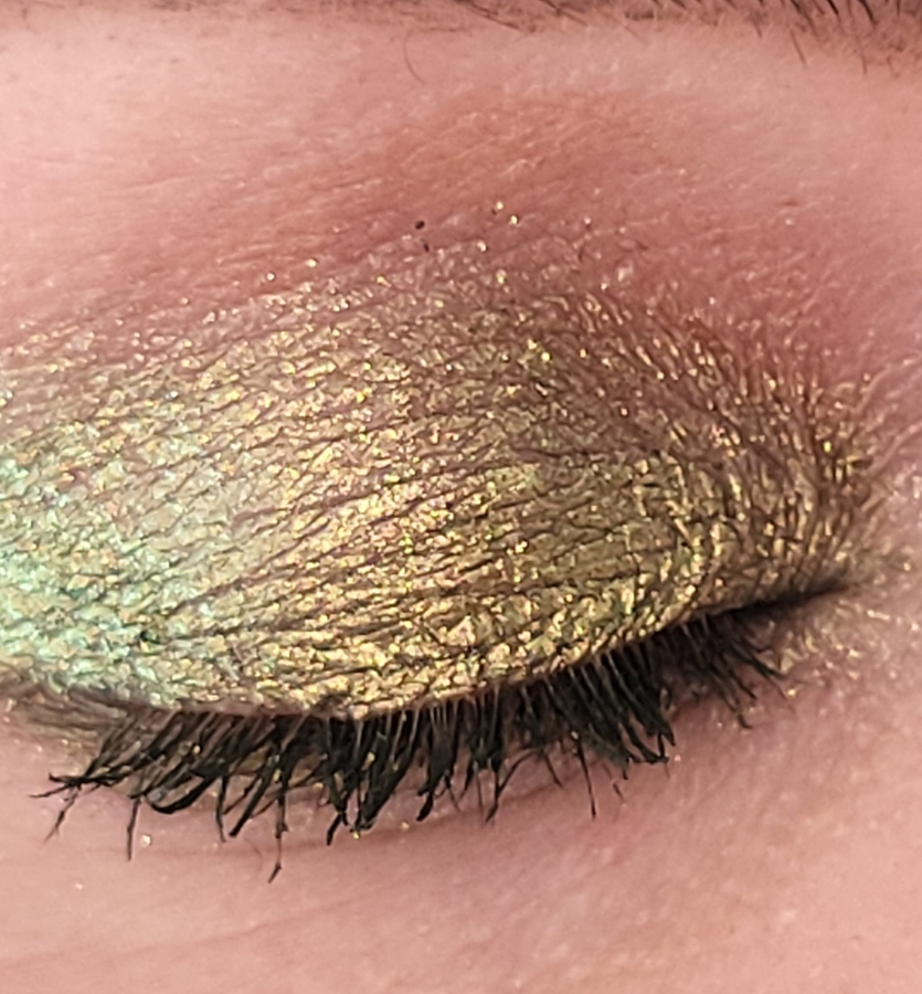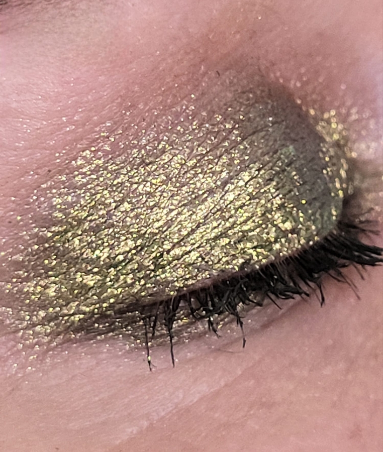 Сами тени я бы назвала даже не дуохромом, они подмигивают нам со стороны триохромов: основной цвет травянисто-зеленый, затем яркий солнечный золотой, но вот при определенном угле наклона пробивается холодный шалфей, а порой и изумруд! И фотографировать мультихромы чрезвычайно сложно, но далее постараюсь показать.
