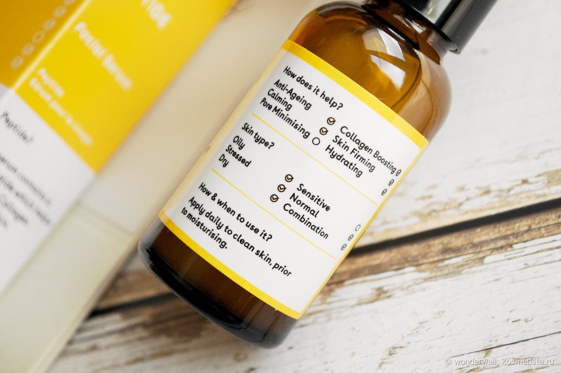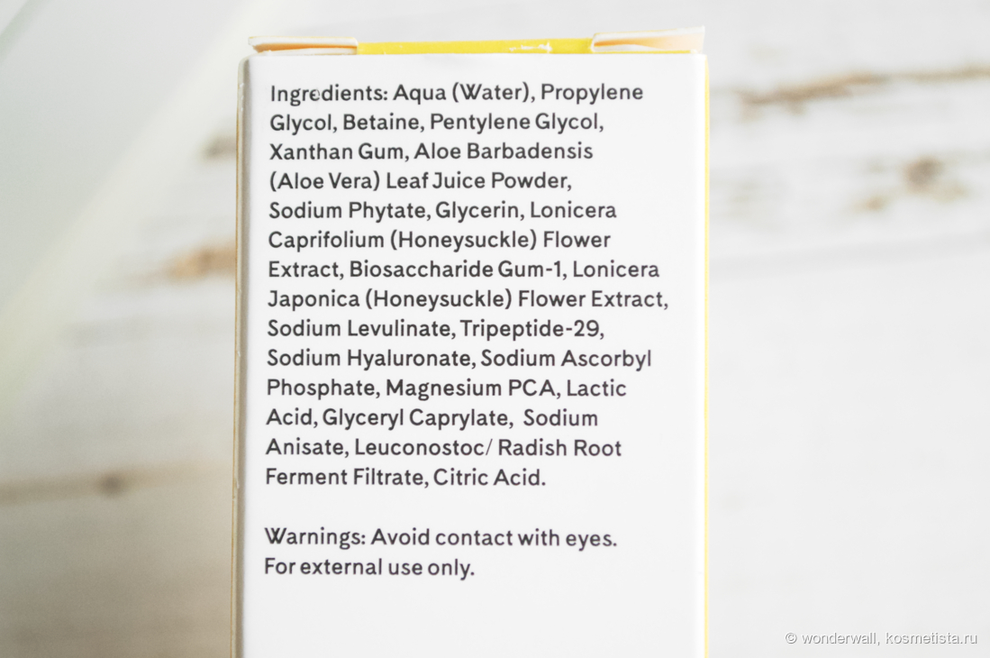 В составе есть комплекс пептидов, гиалуроновая кислота, магний PCA, экстракты алоэ и жимолости. В конце списка находятся молочная кислота и лимонная. Состав многообещающий.