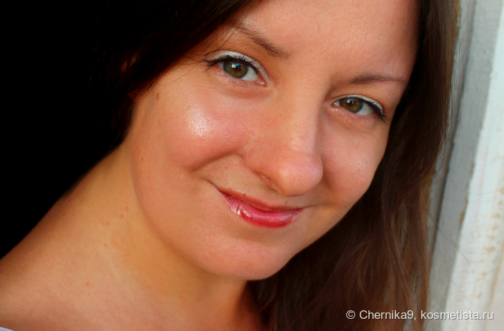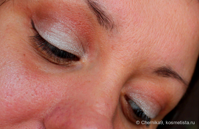 Мне очень нравится этот хайлайтер и его оттенки. Для макияжа я использовала серебристый. Его можно наносить сухим и влажным способом. Если нанести сухим, то получается тонкое серебристое покрытие, влажным — эффект теней. Наносится такой хайлайтер очень тонким слоем. В своём макияже я использую его и как хайлайтер, и как тени. Мокрой кистью я нанесла его на веки, чтобы получить слой серебра, а сухим на щёки.