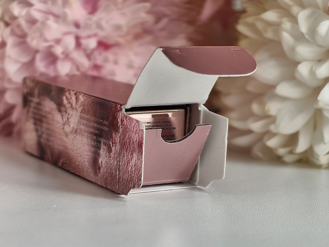 Помада приходит в золотисто-розовой коробке, в которой футляр помады фиксируется с помощью картонной вставки.