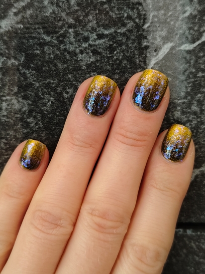 Вообще, я ожидала от Queen Leila чуть большего. Я влюбилась в официальный свотч, в это сочетание бешеного золота и синего. В плане золота я получила даже больше — оно красивее, чем желтый на официальном свотче. Но вот такого эффекта добиться не смогла.((