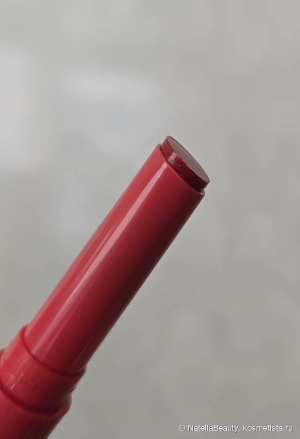 Футляр пластиковый, лаконичный. Цвет футляра повторяет оттенок помады. Как и во всех продуктах в такой упаковке, механизм подачи продукта работает только в одну сторону. Таким образом, не нужно выкручивать много стика, поскольку закрутить его обратно не выйдет. Работает механизм на щелчок.