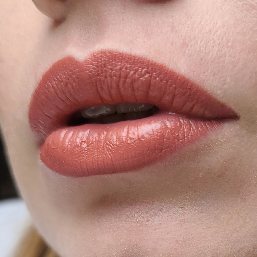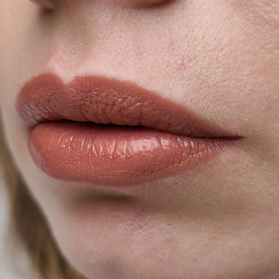 Цвет насыщенный и плотный — перекрывает натуральный пигмент губ с первого слоя. Bali Brown — это теплый коричневый нюд с рыжим подтоном, универсальный для холодного и теплого колорита.