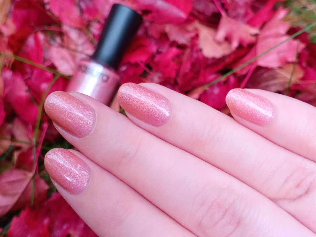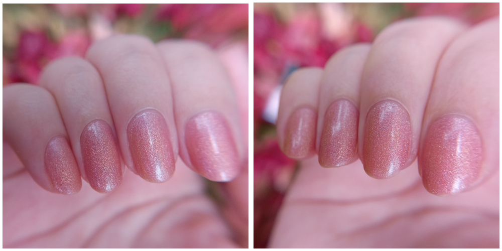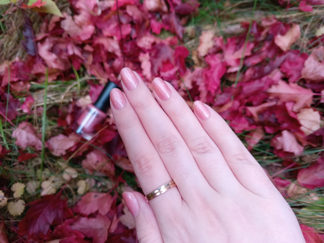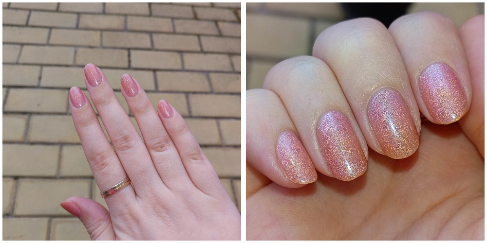 Лак заявлен как коралловый с голографической крошкой. Я не согласна. Коралловый на мой взгляд должен быть намного теплее. Это именно нежно-розовый, теплый с золотистой и серебристой голографической крошкой.