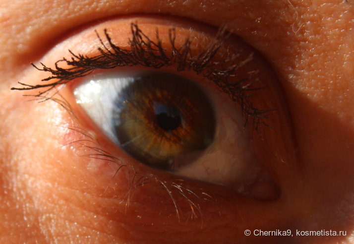 Как видно по фото, они у меня не чёрные, не очень длинные и без подкручивания. Тушь делает их толще и в ярком солнценом свете смотрится вот так.