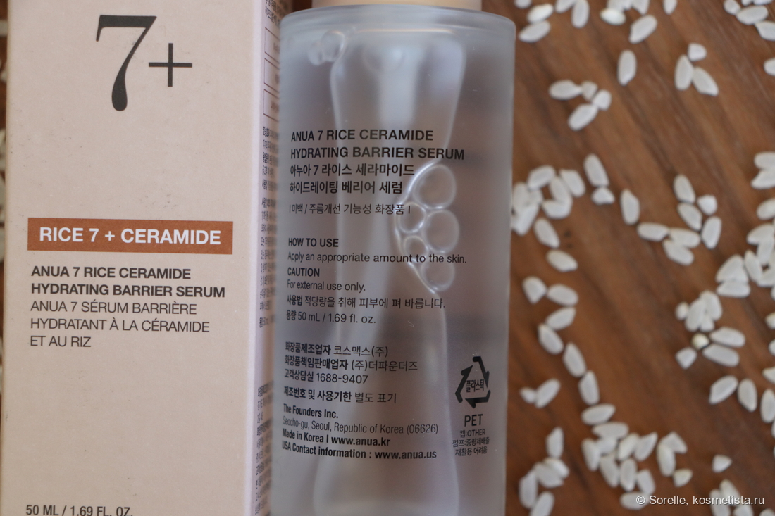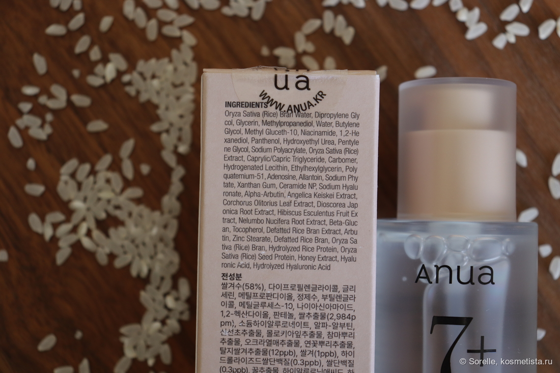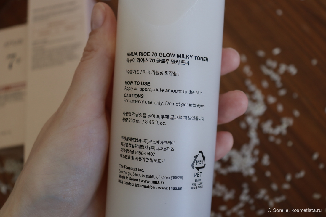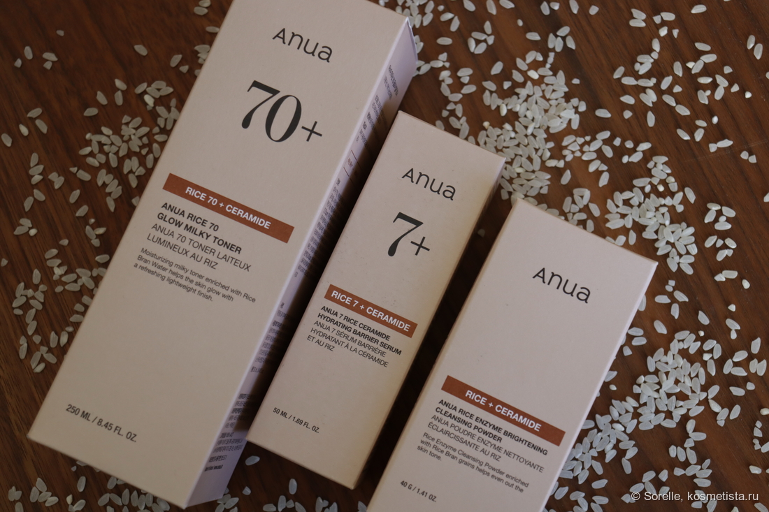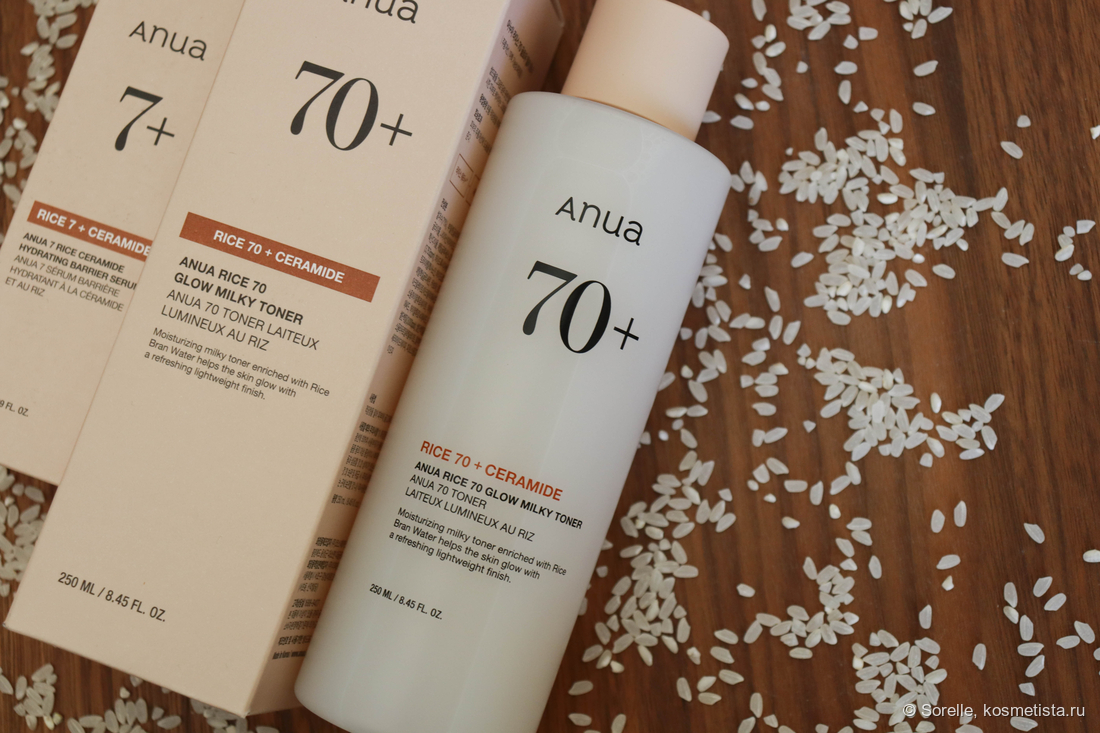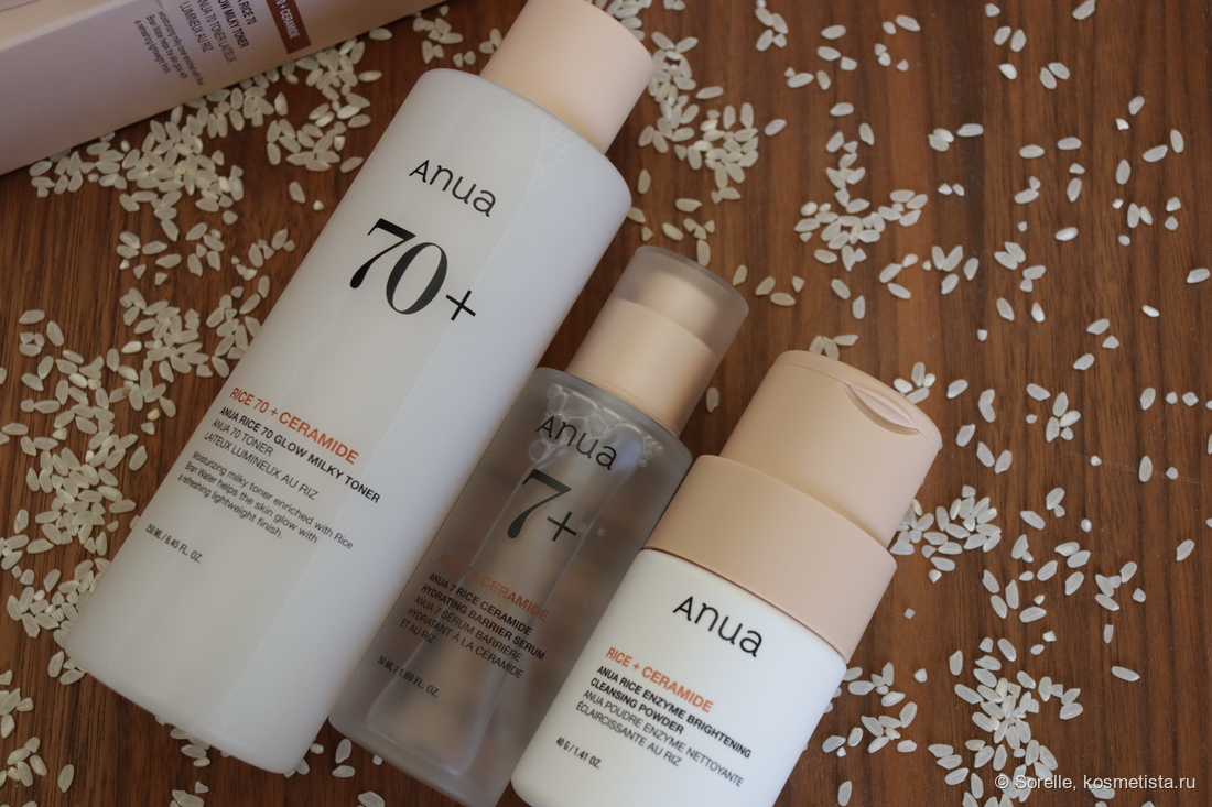 Все средства упакованы в коробки, оформление рисовой линейки очень симпатичное моему глазу во всем, кроме этих ужасных 70+… Раньше бренд указывал %, после редизайна на банках появился +, поэтому теперь мне кажется, что я пользуюсь сывороткой для семилетних, а тонером — для семидесятилетних...