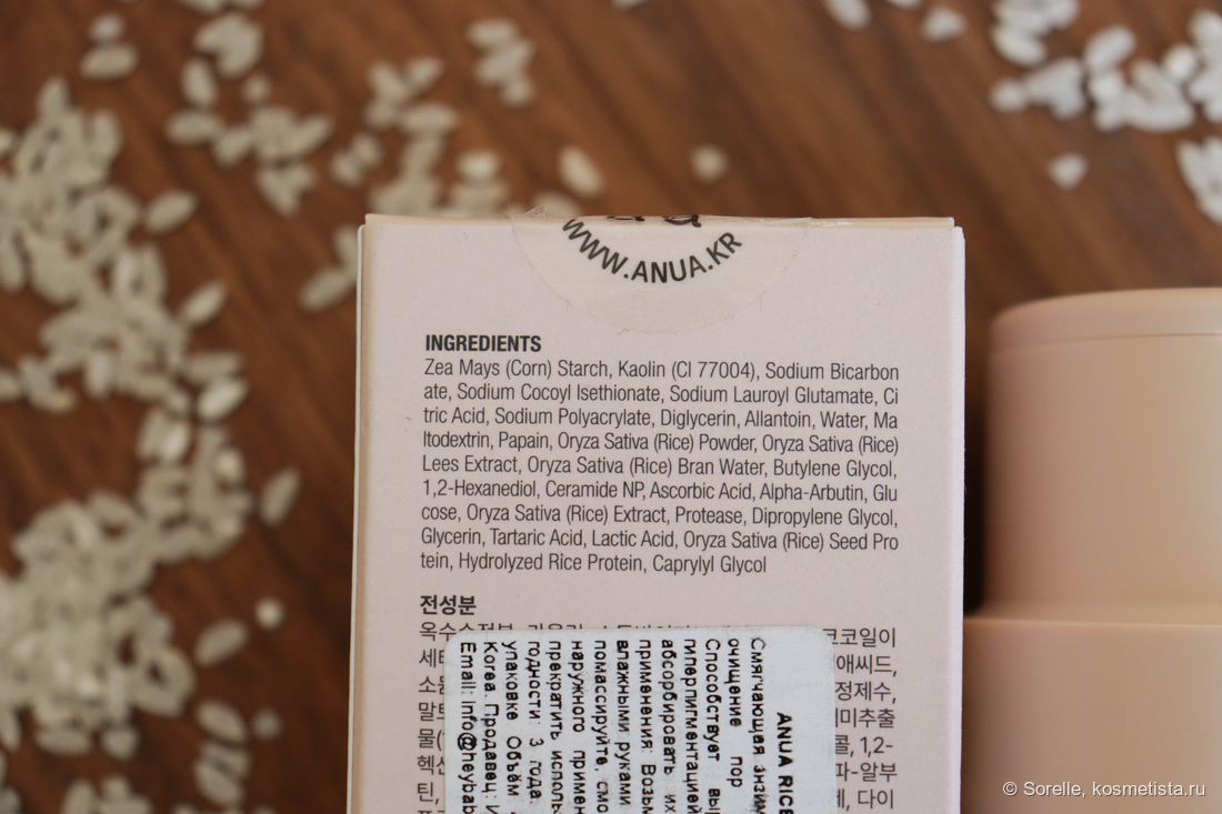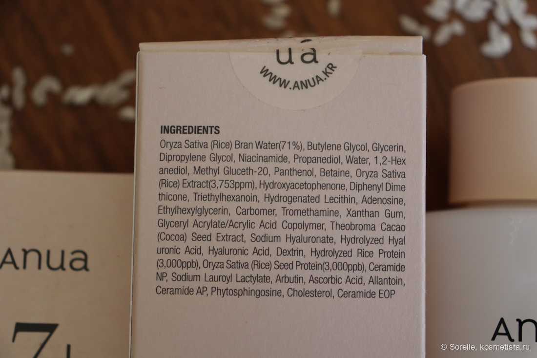 В составе гидролат рисовых отрубей, ниацинамид, пантенол, экстракты (включая рис и мёд), церамиды и несколько форм гиалуроновой кислоты.