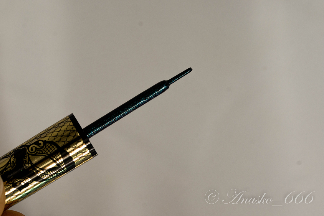 Вообще, я не особый любитель цветных жидких подводок с тех самых пор, как в моей косметической жизни появились пигменты и липкий праймер. Но пигменты все же более затратны по времени, а тут еще и подводка-то в моем люимом цвете, а значит шанс ей пользоваться повышается в разы. Когда-то у меня была похожая подводка от Gosh в похожем оттенке, вот только вместо кисточки, как у героини поста, у подводки от Gosh был жесткий и неудобный фетр.