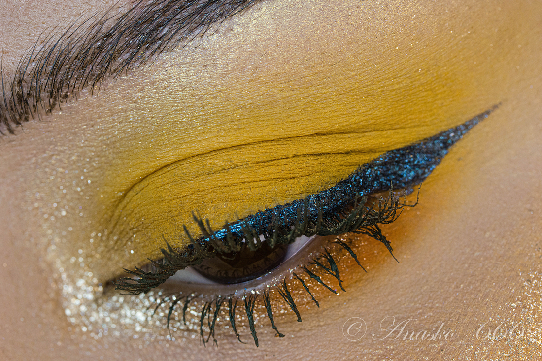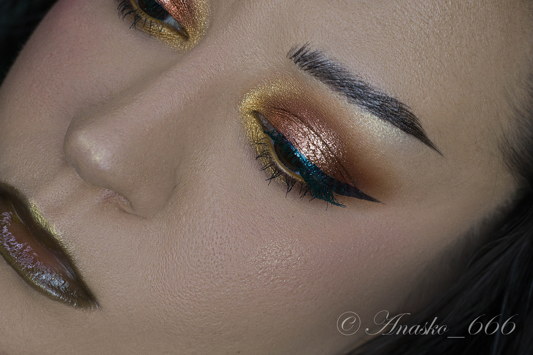 А вот на шиммерные тени мне подводка в нанесении соло не понравилась: в два слоя появилась текстура там, где ее практически нет. Но смотритья она эффектно, спору нет.