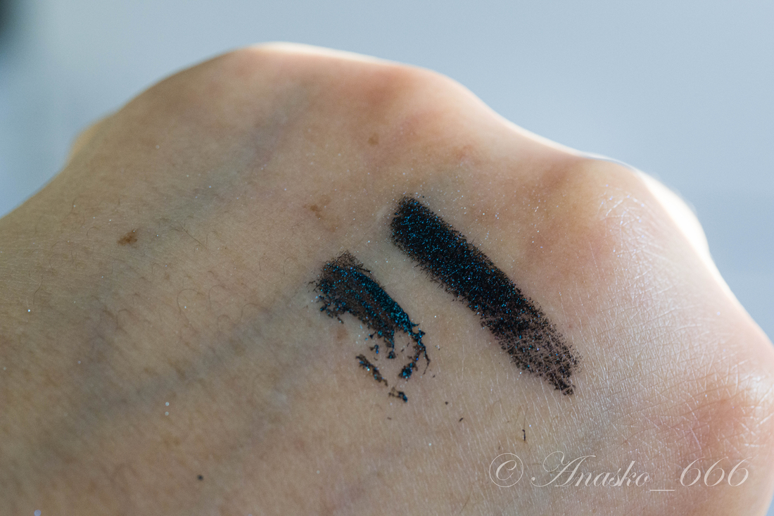 Чаще всего подводка именно такая: изумрудный шиммер на темной базе. На свотче (слева направо) подводка нанесена в один слой, в два слоя и на черную базу. На превом свотче можно увидеть полупрозрачную серую базу. Подводка довольно плешива в один слой, а в два может стянуть и подчеркнуть текстуру, да еще и может отвалиться кусочками. На дополнительный слой из более темной подводки уже лучше, но тогда зачем мне подводка, когда с той же темной подложкой и пигментами я сделаю тоже самое ненамного больше потратив времени… В общем впечатление довольно среднее, да и сравнении с той же подводкой от Gosh, героиня поста явно проигрывает...