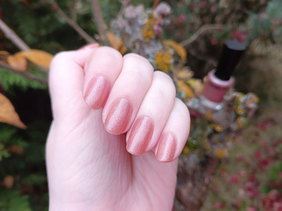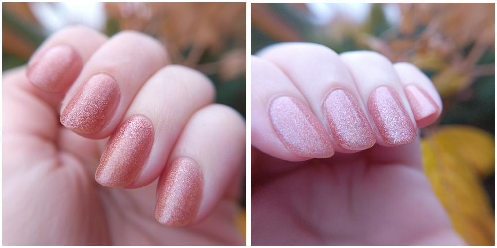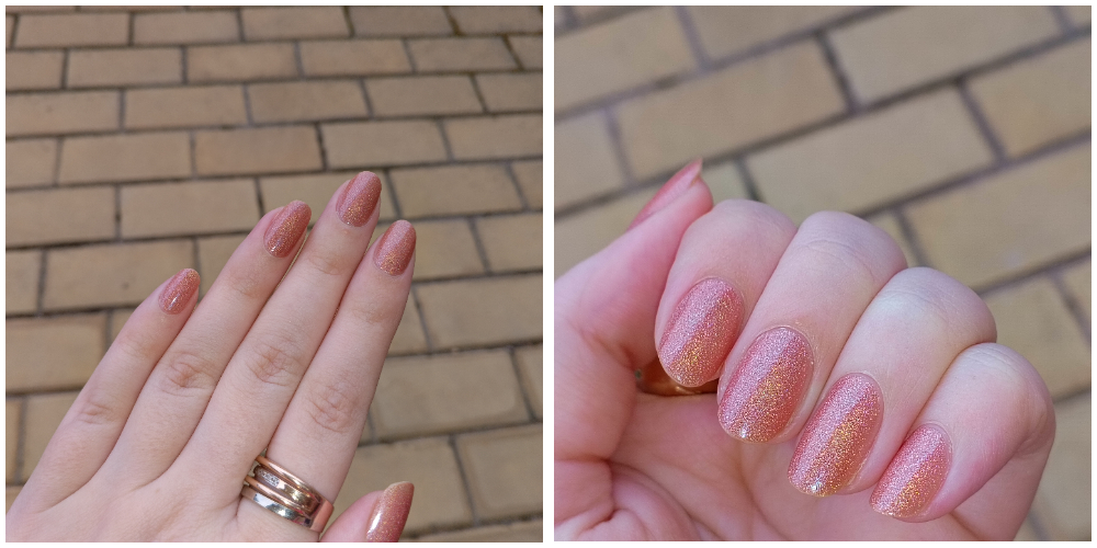 Оттенок заявлен как коричневый с россыпью голографии. Я не согласна. Это скорее светло-кофейный оттенок с едва заметной розовинкой. А голография серебристо-золотистая.
