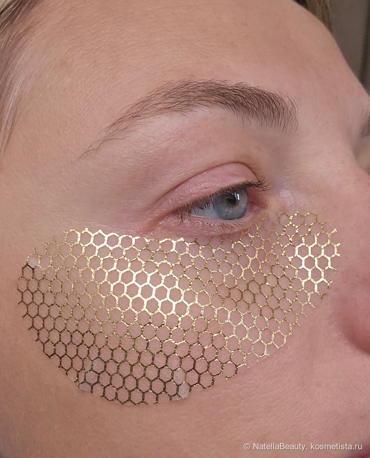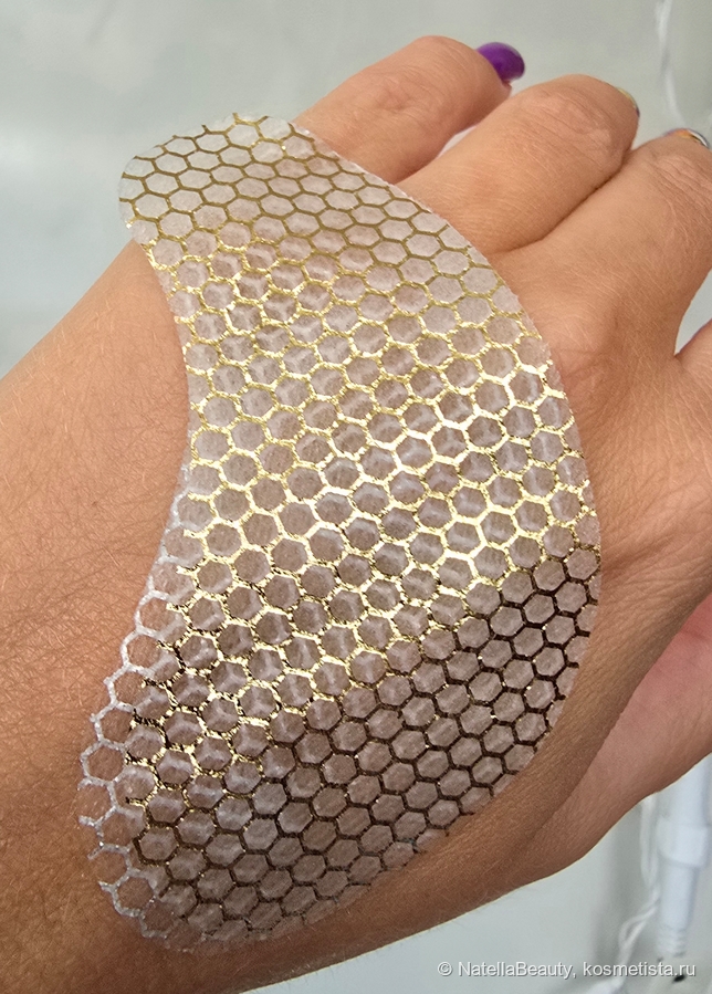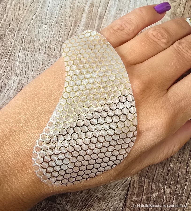 Сами патчи тканевые, с изображением сот пчёл. Орнамент золотой, выглядит очень симпатично.