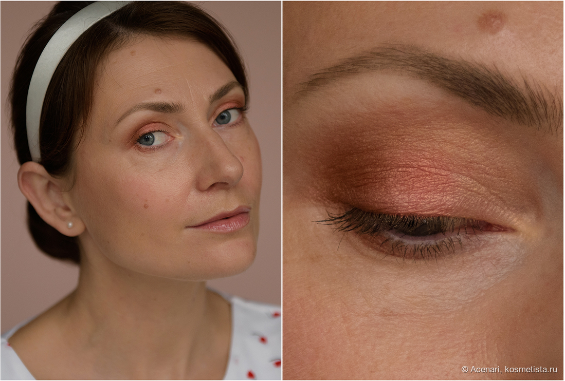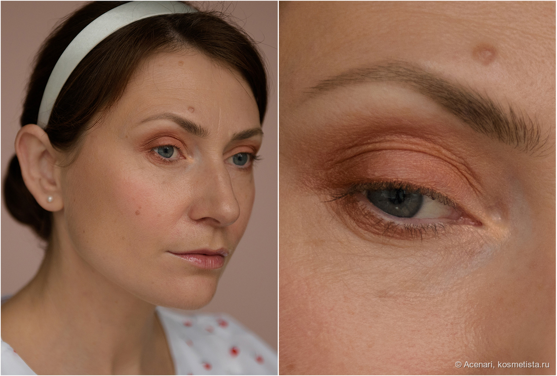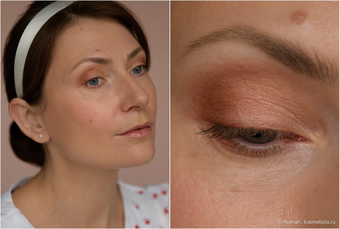 А ещё уверена, что этим теням подойдет более плотное бронзирование лица и подсвечивание хайлайтером. Типа перезагорала и утомилась отдыхать под южным солнцем.