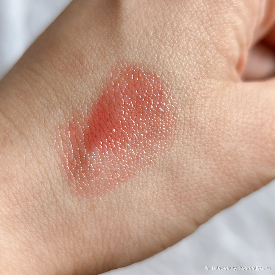 Оттенок 04 Hippie Berry — это красивый розово — красный, причём в стике он насыщенно красный, на свотче тоже больше красный, а вот на губах уже больше розовый. Цвет красивый и достаточно яркий, мне такой нравится. Финиш — заметно глянцевый. Уход есть, но недолго и не очень сильный. Если на губах есть шелушения, то бальзам их подчеркнёт. Но в целом ведёт себя хорошо. Выдерживает перекус, чашку кофе, но после обеда глянец почти весь уйдёт, но при этом цвет останется, потому что бальзам ещё и тинтует губы. Губам с этим бальзамом вполне комфортно. Есть липкость, хоть и не критична, и после еды обязательно нужно проверять, не остались ли на губах крошки 🙂