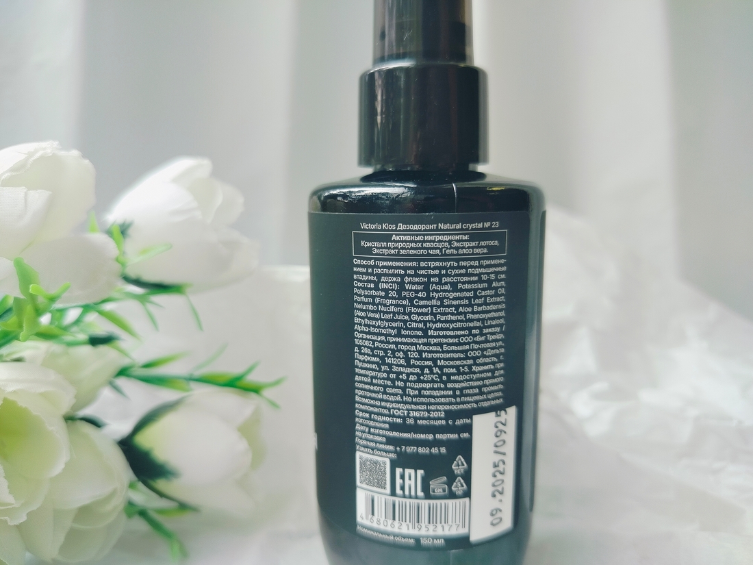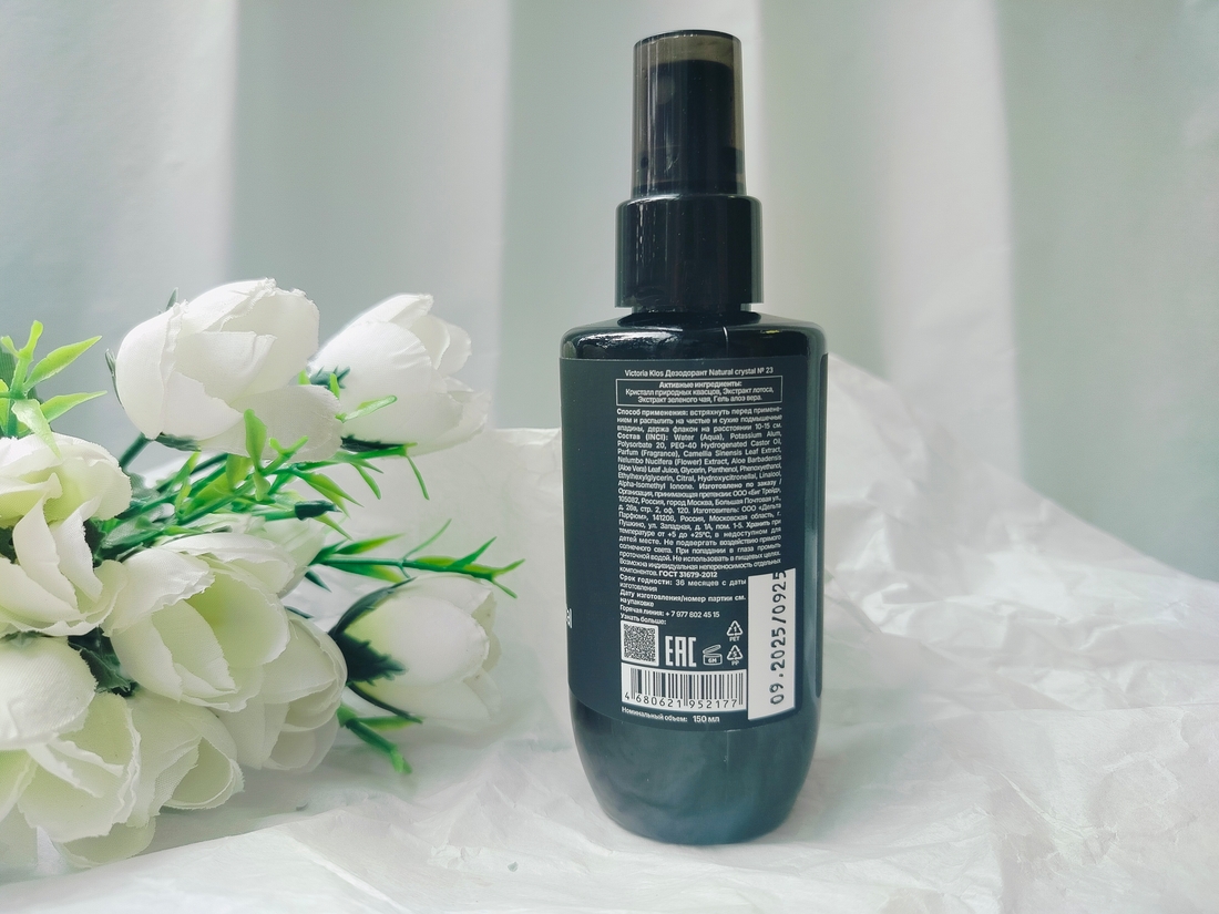 Это мой первый дезодорант подобного плана. Пероидечески пользуюсь твёрдыми кристаллическими дезодорантами — очень нравятся, надолго защищают от неприятных запахов, удобны в использовании. Но есть один большой минус — при падении разбивается на мелкие осколки. Рада возможности попробовать дезодорант в новом для меня формате — кристаллический спрей Victoria Klos с ароматом, навеянным популярным Bayredo Blanche.
