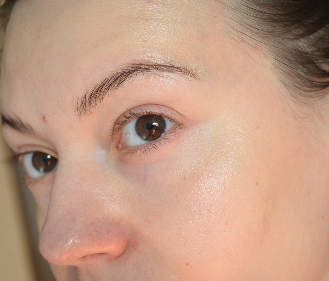 Мне 33 года, у меня комбинированная кожа, ближе к жирной. Кожа не реактивная, не чувствительная, и аллергии на косметику у меня, к счастью, не бывает. На крыльях носа есть купероз, на самом носу — чёрные точки, куда же без них-то? 😑