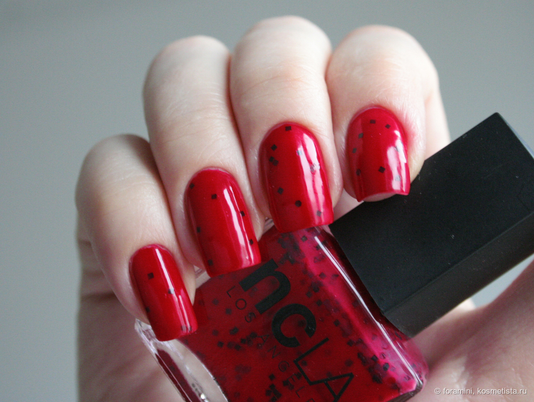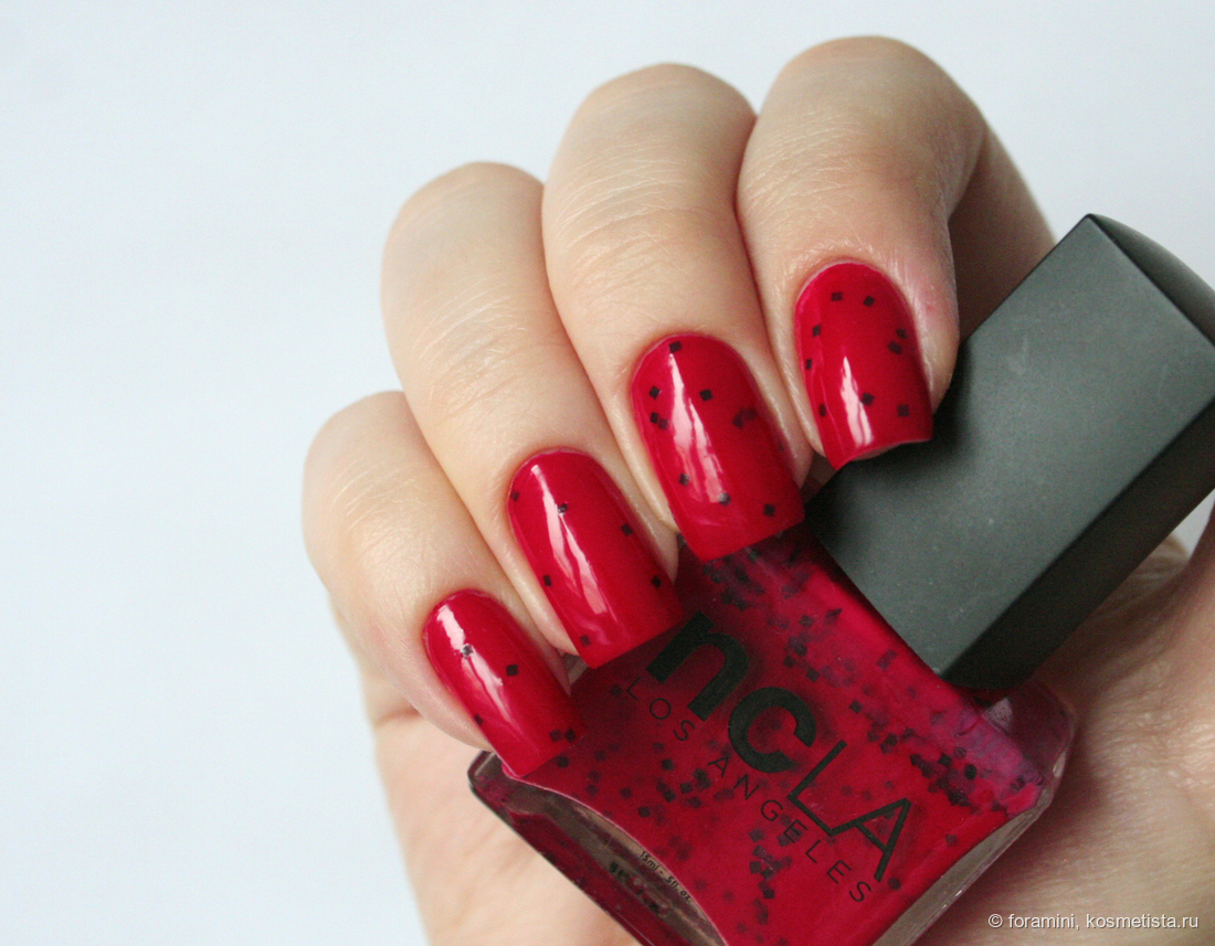 Цвет базы — насыщенный красный с холодным вишневым подтоном. В качестве наполнения — матовый черный глиттер в форме квадратиков.