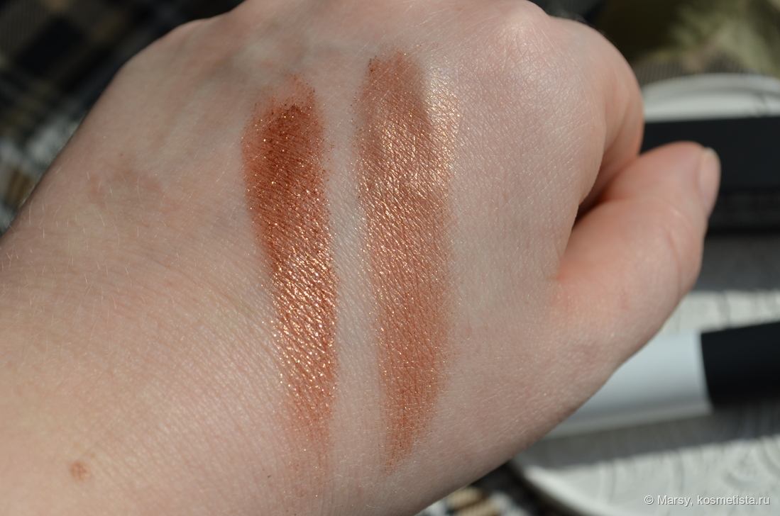 Обратите внимание, что слева оттенок без базы, а справа на базе. Я сама немного удивилась, но на базу тени ложатся тоньше и полупрозрачнее. Конечно, можно наслоить и использовать влажный метод, но я хотела показать их работу при простом использовании.