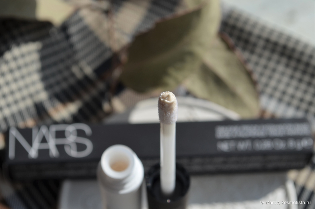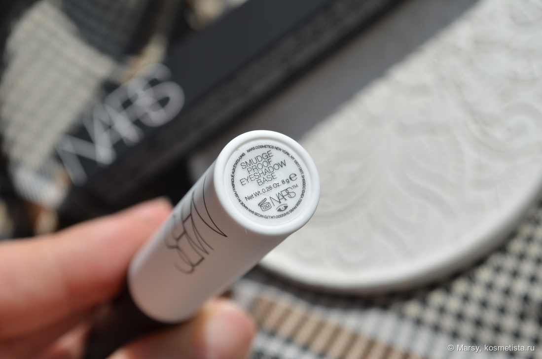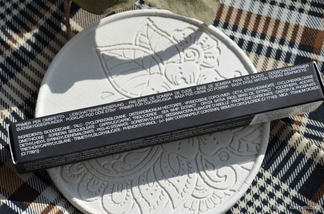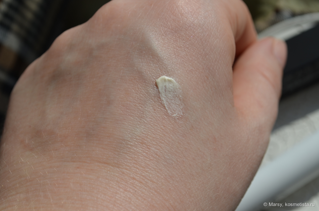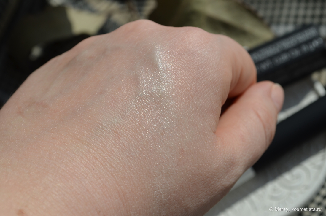 Текстура белесая, при распределении прозрачная, тактильно силиконистая, приятная, быстро усаживается на веках.