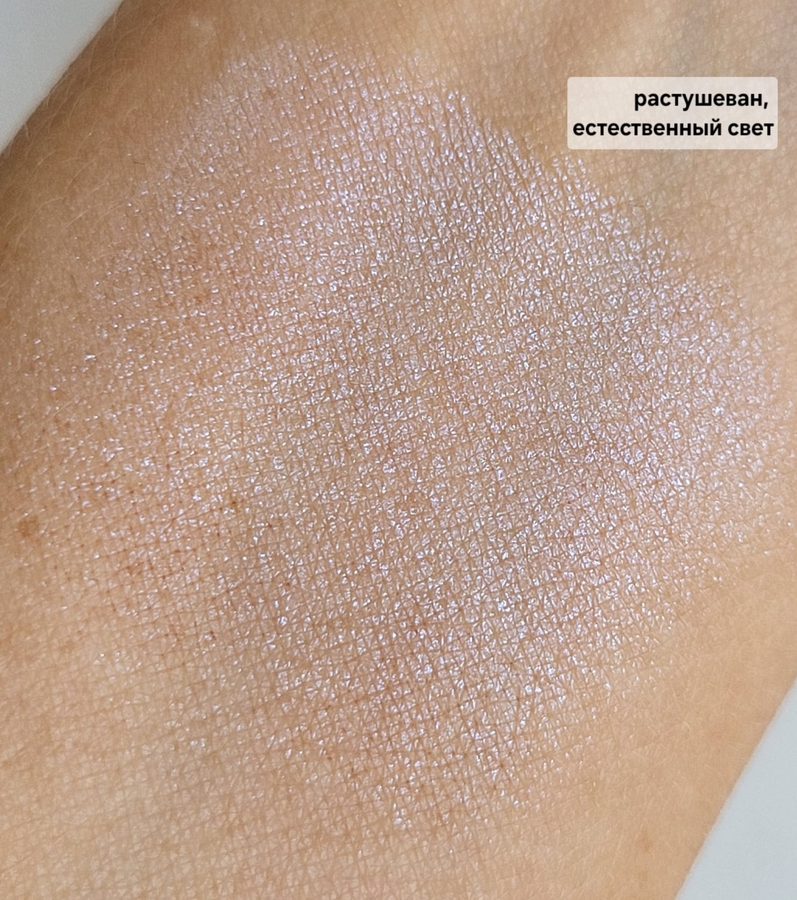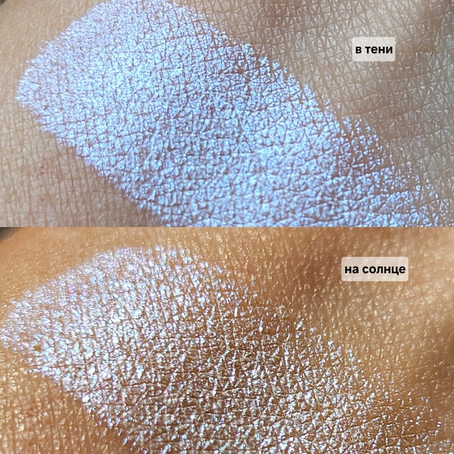 Это переливающийся серебристо-сине-фиолетовый оттенок с очень мелким перламутром на бежевой прозрачной базе, который придает коже заметное сияние и холодный оттенок. Дуохром ранних выпусков.