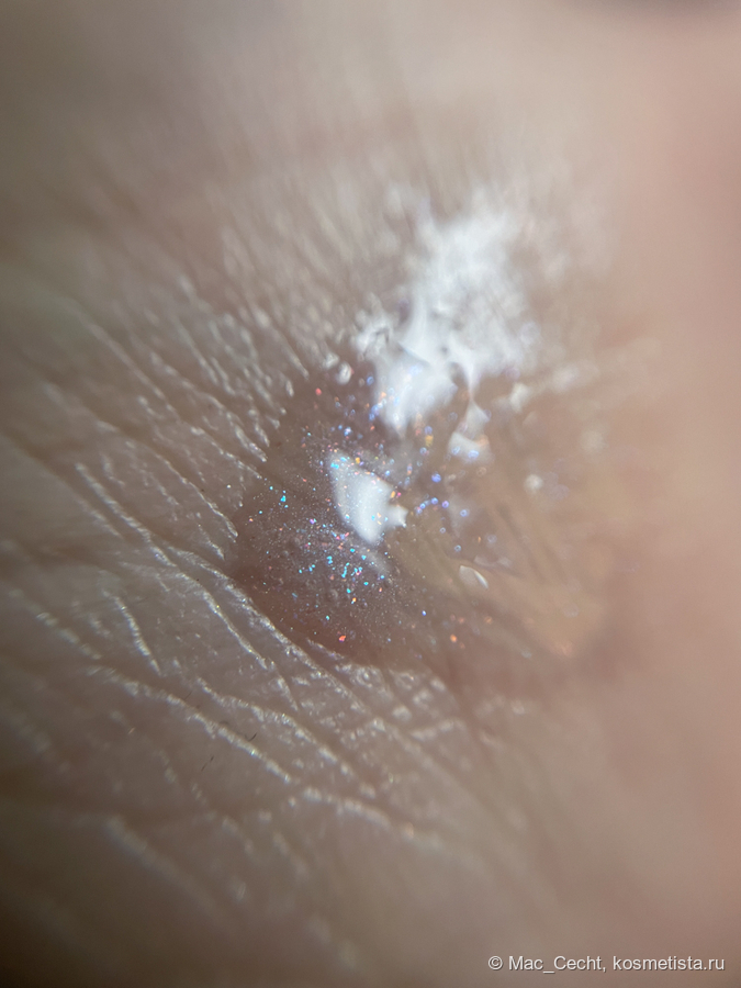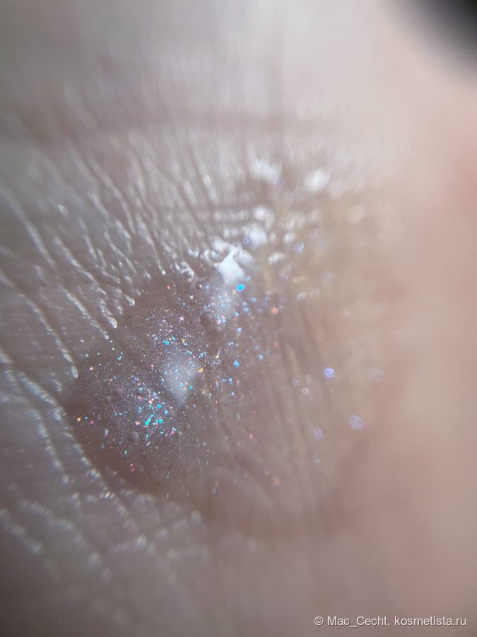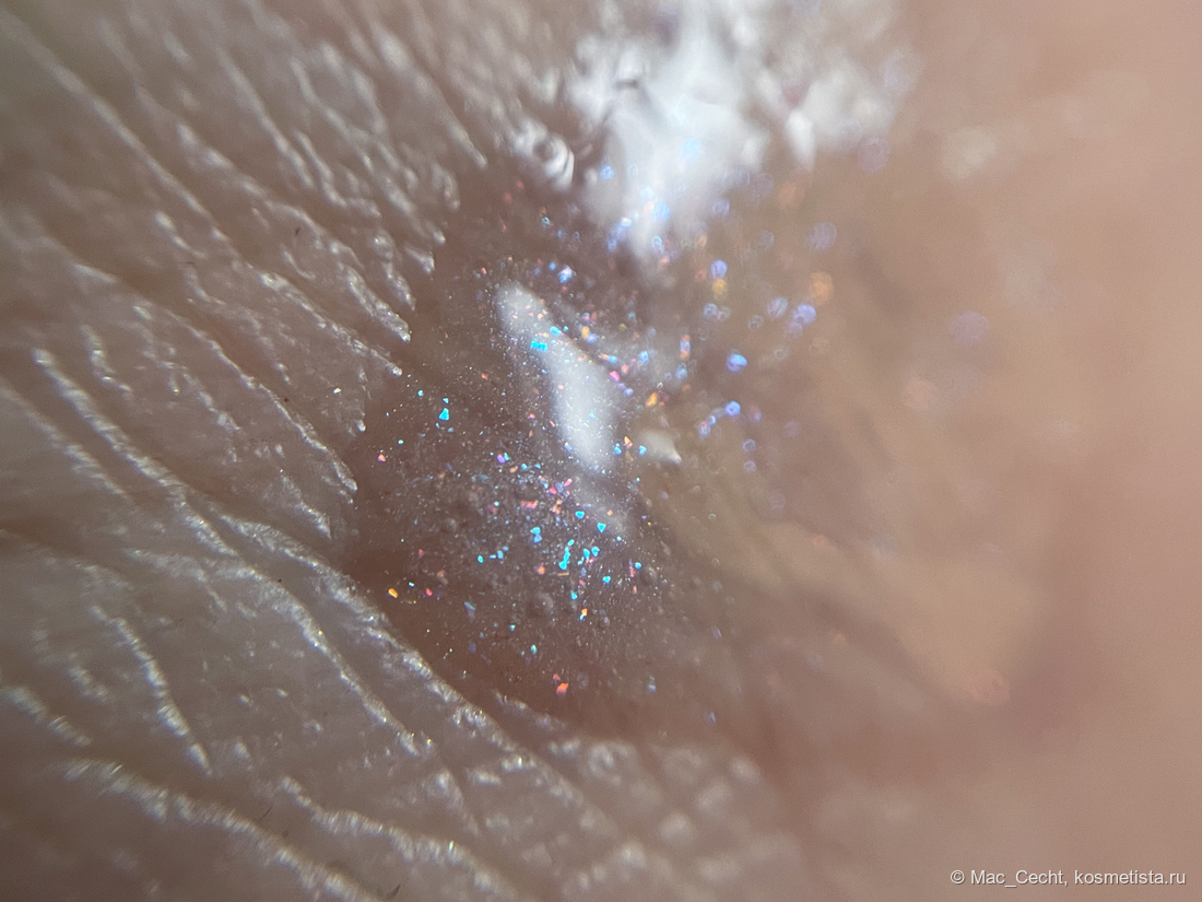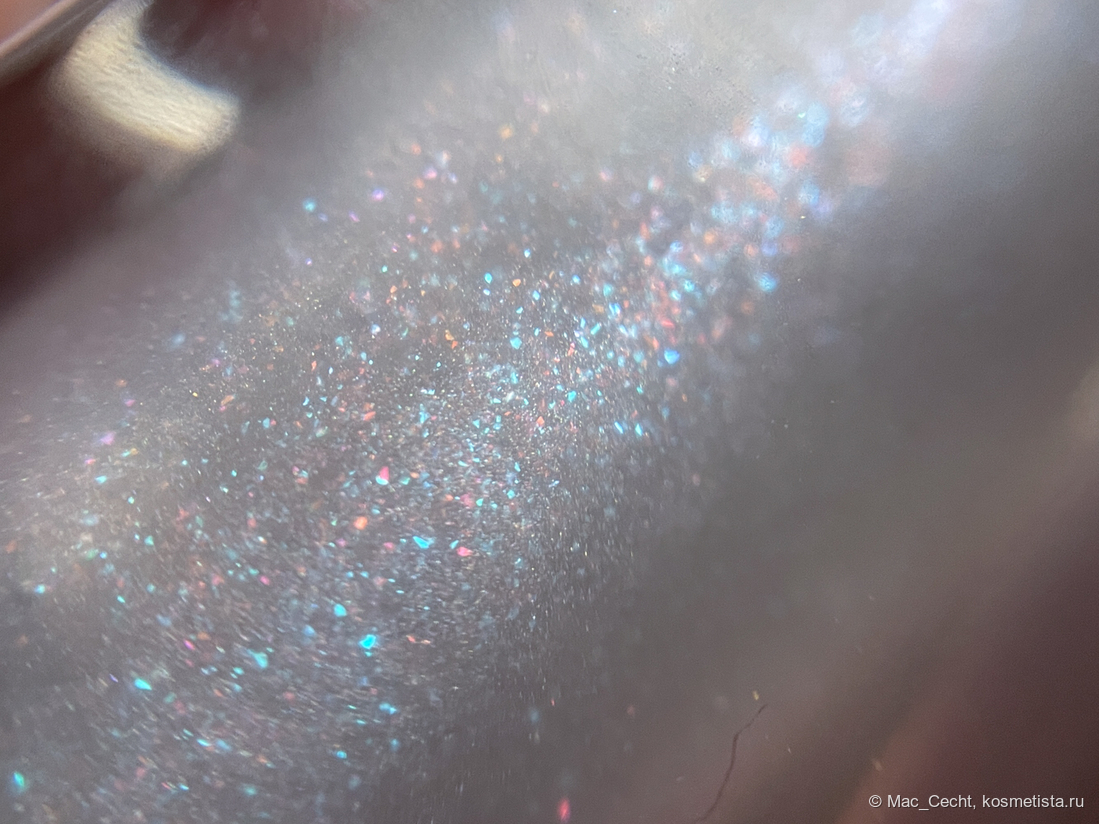 Celestial Purple — это серо-фиолетовый (даже больше серый, чем фиолетовый) блеск с мельчайшими разноцветными блестками. В основном, с голубыми и розовыми, но есть и золото, а еще — что-то типа серебристой слюды, смолотой почти в пыль.