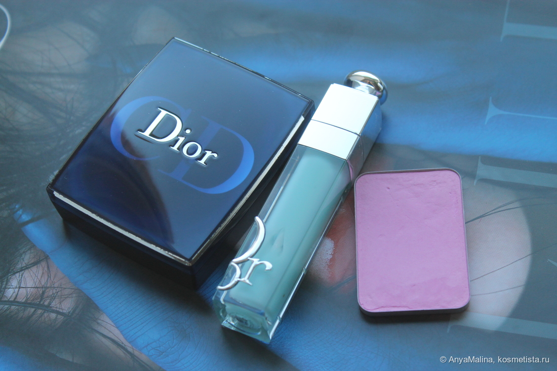 Чуть тепловатый серый, базовая сияшка на серебре и жемчужный полупрозрачный розовый. Как же я её хотела, кто бы знал. В розовом такая заметная ямка, пара серых тоже хорошо затерта. В синей палетке еще даже рисунок диоровский каннаж легко читается.