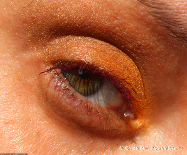 Здесь мне уже захотелось более ярких красок, сочных и осенних. Я нанесла на складку века розовый оттенок, а ближе к ресницам мандариновый.