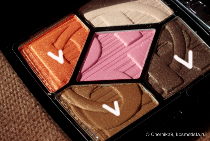 Самый яркий из них апельсиновый (я бы назвала его мандариновый), розовый, розово-бежевый, тёплый печосный и светящийся коричневый. С ними можно сделать довольно яркий и тёплый макияж на каждый день и не только.